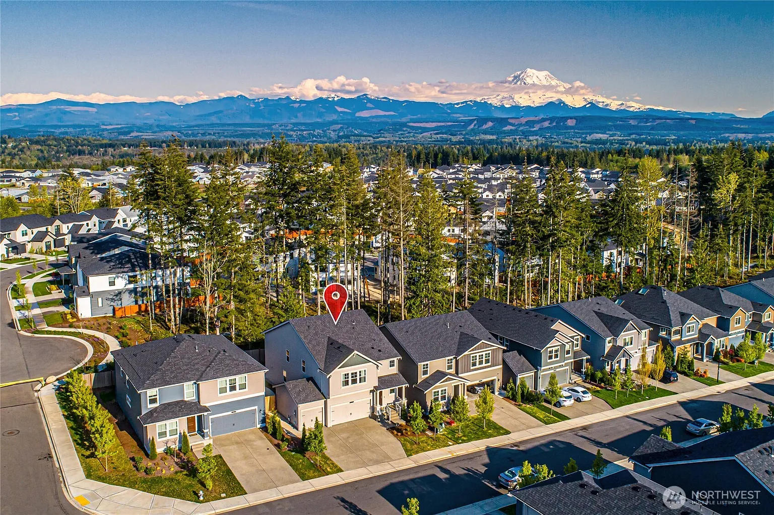 2/1 RATE BUYDOWN available! Experience rare Mt. Rainier panorama directly from your living room, kitchen, main bed and bath in this 3-yr-new home. Enjoy coffee or dinner with this stunning backdrop, comfortably inside your beautifully designed home. Features: spacious kitchen with crisp white cabinets & island; open-concept living/dining, sleek fireplace, bright faux wood floors throughout, large storages, EV charger prewire. Main-floor bed/bath is guest-perfect. Primary suite w expansive windows & Mt. Rainier vista. Upstairs: bonus/movie room, laundry, all bedrooms w walk-in closets for ultimate convenience. Green belt with a view + nearby trails/parks (incl one behind home) for blissful daily escape. Style, serenity & scenic beauty await!