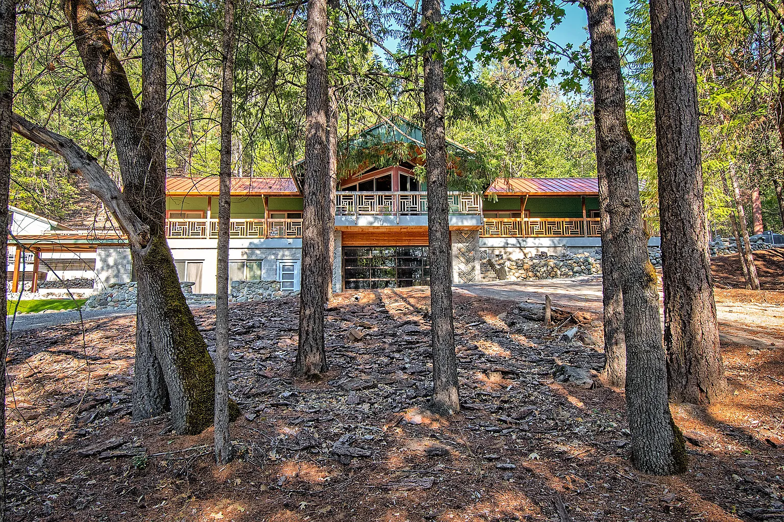 A once in a lifetime opportunity to acquire this spectacular property. A custom design floor plan that is inviting and elegant. This home is situated on the hillside and offers an abundance of privacy 360° around the home and sweeping views of the pine trees and open space. Enjoy listening to the rushing water of Trinity River that is located across the street. Perfect for for the work at home professional. This resort-like home features an open floor plan with vaulted pine ceilings, Cumaru hardwood floors throughout the home, light filled great room with the sliding glass doors to the covered balcony, built-in cabinets, and the exquisite kitchen that offers granite countertops, large island, Guerrero custom cabinets, stainless steel appliances and a butcher block made from cherry, black walnut and maple wood.This home includes a split floor plan, with 2 bedrooms and a separate guest quarters with a bathroom across the covered breezeway with its own entrance. The master suite features sliding glass doors to a private covered balcony, walk-in closet and spa-like bathroom. The 2nd bedroom has built-in cabinets with a murphy bed. Downstairs you will find a sizable room with lighting and a full bathroom. Enjoy the sauna, spa, covered fireplace w/storage and a garden area. 400 amp utility for every type of electrical need.
