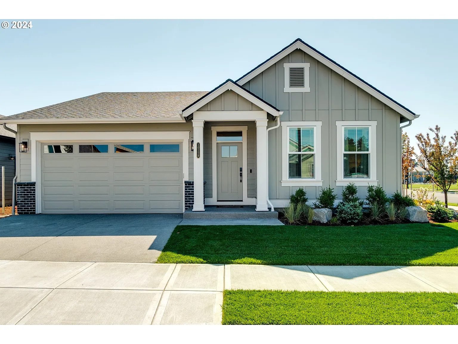 MODEL HOME and MOVE IN READY! Complete with all appliances and blinds throughout. This East facing 1 level Farmhouse style home is on a corner lot with many upgrades. The generous sized entry leads into the open great room area with 11 foot ceilings, kitchen with large pantry, gas appliances, large island, quartz counters and soft close doors. The large private covered vaulted patio is perfect for entertaining looking into the treed commons area. 3 bedrooms plus a convenient den/flex room. HOA includes neighborhood park, pool and clubhouse and front yard maintenance! Photos of the actual home. $5,000 incentive available on this home using Pahlisch's preferred lender, Hixon Mortgage. Restrictions apply.