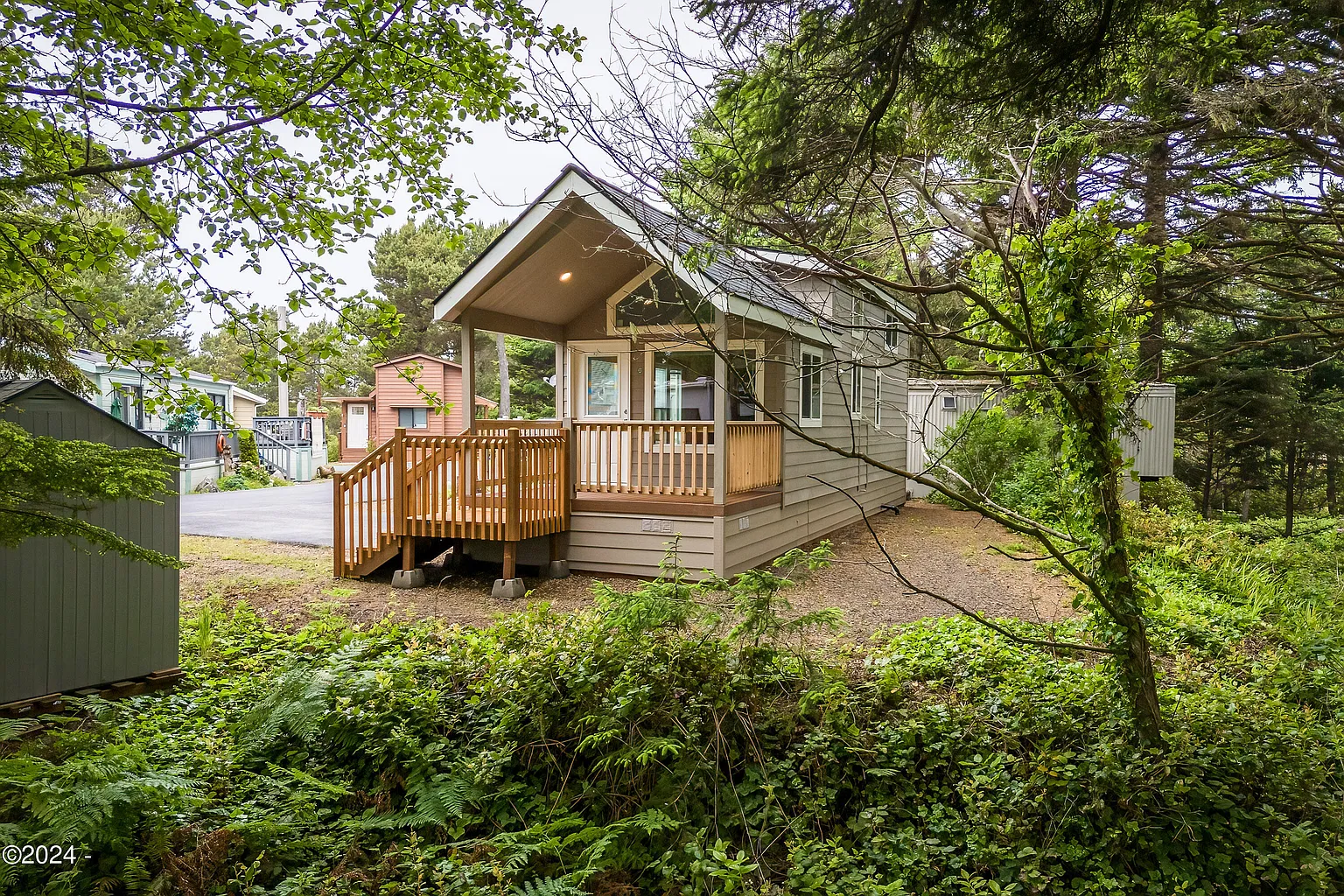 Coastal jewel box living at its finest! Step onto this incredibly charming & cozy park model in the desirable 10-acre, ocean front Holiday Hills Manufactured Home Community. Imagine being only a 5-minute walk to miles of sandy beach where you can get a little exercise, or just relax on your beach chair and enjoy the cool clean ocean breezes. With an inviting vaulted ceiling, the large composite entry deck area is a great place to enjoy your evening cocktail, morning coffee, or an afternoon nap. The light filled great room, boasts a very chic kitchen with custom cabinetry, stainless appliances and quartz counters. And the vaulted ceilings provide an extraordinary element of spaciousness in this perfect little beach bungalow. The bathroom is bright and there's even a coveted stack washer/dryer hookup in the hallway. And don't forget the large stairway-accessed loft perfect for secondary sleeping or for your weekend guests. Great for kids and grandkids too! With one of the choice locations within the community, you'll love the views onto the ravine surrounded by majestic trees and beautiful green spaces. Plus, there is plenty of room for 2 cars. Perfect for year-round living or as a weekend or season retreat, this endearing home is your opportunity to enjoy oceanside living at a very affordable price. Space rent just $695 (no rentals)