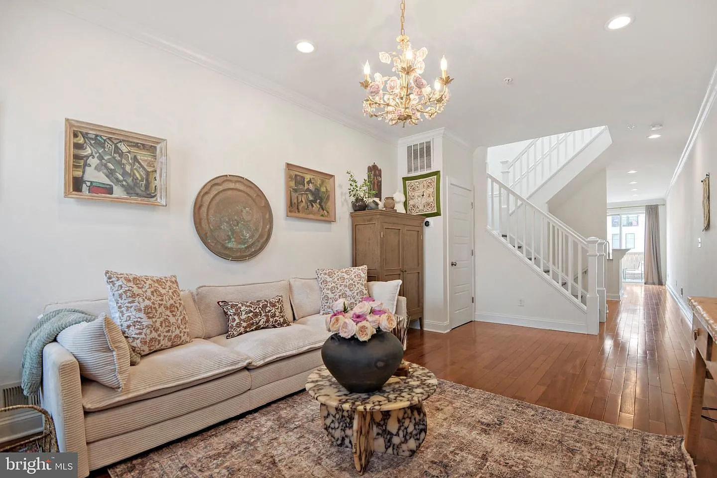 Welcome to 3858 Quarry Ave, a beautifully updated home in the heart of Hampden, offering nearly 1,800 square feet of thoughtfully designed living space across three finished levels. Complete with a private parking pad, this home blends modern convenience with one-of-a-kind custom details. Step inside to find tall ceilings, rich wood flooring, recessed lighting, and fresh paint throughout. The main level is both stylish and functional, featuring a stunning kitchen with white cabinetry, stainless steel appliances, and gas chefs stove. Elegant Calacatta Monet marble countertops imported from Italy elevate the space, while a dedicated dining area flows seamlessly to the rear deck perfect for morning coffee or evening gatherings. Upstairs, the primary suite offers a luxurious retreat with a spa-like bathroom, including a double vanity and oversized shower. A second bedroom and full bath complete this level. Throughout the home, you’ll find unique artistic touches, including hand-painted murals in two bedrooms and a custom stained glass transom window above the front door. The living room is anchored by a striking handmade chandelier sourced from Milan, adding a distinctive designer element. The fully finished lower level provides a versatile third bedroom, third full bath, and a separate laundry room, along with access to a fully fenced backyard ideal for entertaining or relaxing outdoors. Located just steps from all that Hampden has to offer renowned restaurants, charming cafes, and boutique shopping with easy access to I-83 and major commuter routes.