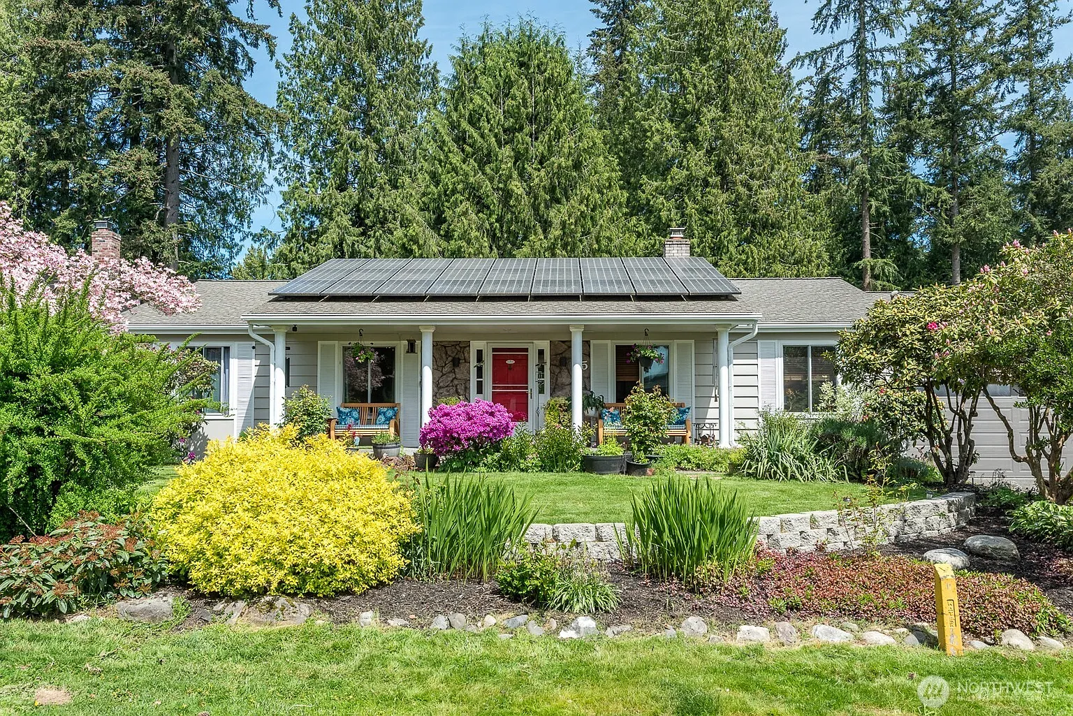 Charming and fully updated rambler on over 1/3 acre in a quiet cul-de-sac and peaceful neighborhood! This move-in ready home offers a modern, open floor plan with multiple living areas, a custom kitchen with high-end appliances, and stylishly renovated bathrooms. Sliding French doors lead to a large deck and a beautifully landscaped yard—perfect for entertaining, gardening, or relaxing. Enjoy energy efficiency with owned solar panels and an EV charging station. Bonus features include a garage workshop and a brand-new septic system. Ideally located between I-5 and I-405, this home offers unbeatable convenience for commuters in a truly great location!