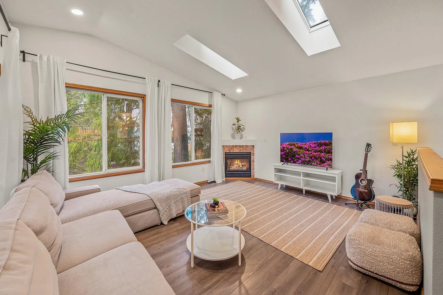This lovely light-filled 3-bedroom / 2-bathroom contemporary home offers a serene and private setting surrounded by trees and bordering Ash Creek. As you enter the property, the vaulted living room with a slider to the covered deck greets you, creating the perfect space to relax and enjoy the beautiful views and sounds of nature. The gas fireplace in the living room warms up the space on cool days, and 7 skylights throughout the home provide natural light all year long. The spacious kitchen features an abundance of maple cabinets and a gas range, making it the perfect space for cooking and entertaining. The dining room also boasts vaulted ceilings and an abundance of natural light through south-facing windows. The main level bedroom/den with a bathroom provides flexibility for use as a home office, guest room or a comfortable space for family members. The lower level features another two bedrooms and a shared bathroom, along with a spacious laundry room and additional storage. The sunn
