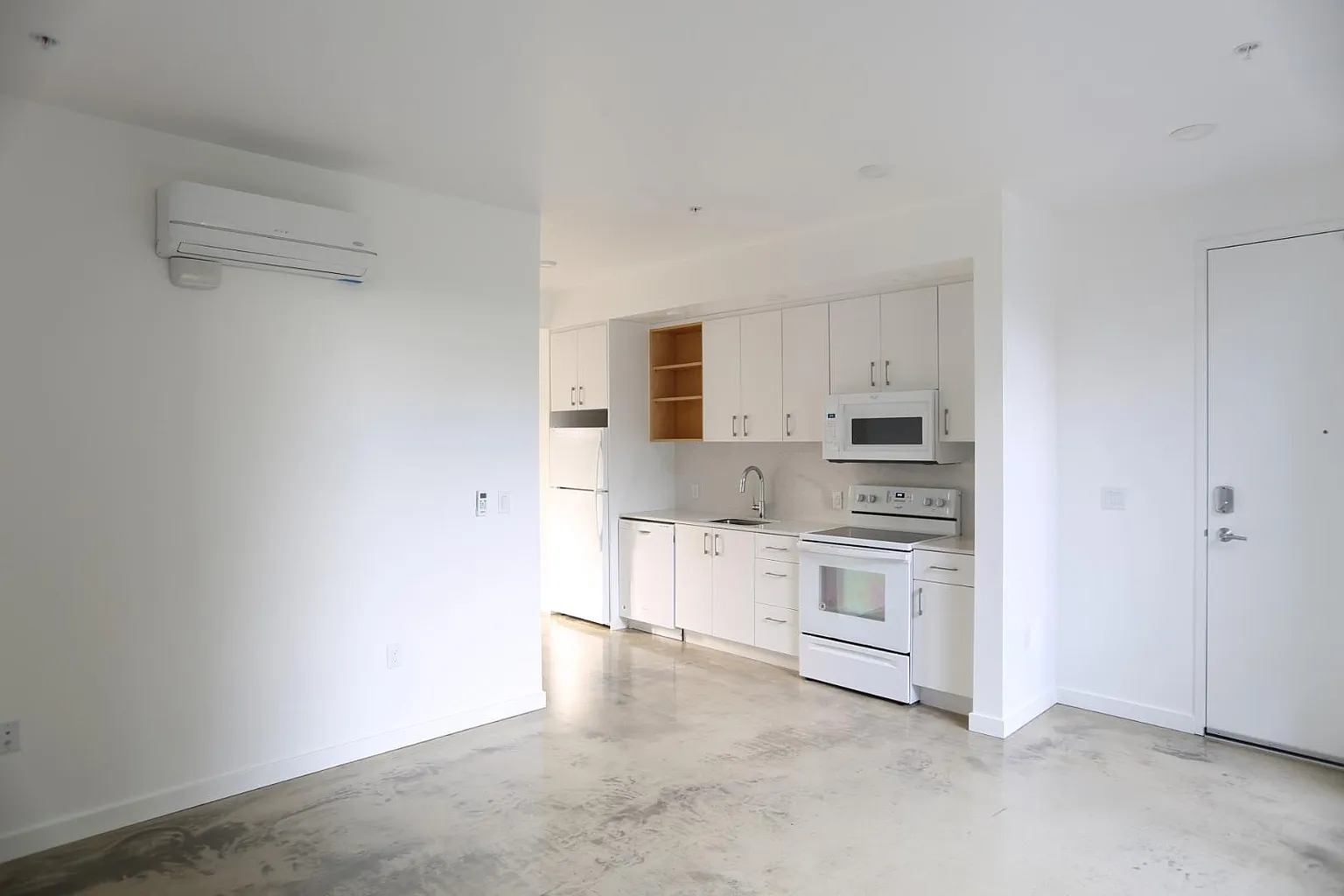 This top floor 1 Bedroom apartment is light and bright. With floor-to-ceiling windows, you'll get as much light as you can get this winter. Fully equipped kitchen, A/C, and coveted in-unit laundry. We are pet-friendly. The application period is open. Welcome home to a unique Portland apartment building. No long dark hallways and tiny cramped apartments here. 19 Modern, light-filled, airy apartments wrap around a beautifully landscaped courtyard. Generously sized studio, 1 bedroom, and 2 bedroom apartments, many of which include a balcony or patio. Concrete floors, modern crisp white cabinetry, high ceilings, Caesarstone countertops, and gorgeous tiled bathtub are standard in all the units. On the edge of the Concordia and Cully neighborhoods on NE 42nd, we are conveniently located close to popular neighborhood restaurants - Pizza Jerk, NEPO 42, and Tiny Moreso. The open application period for this unit will begin Sunday, August 3rd at 12 noon.