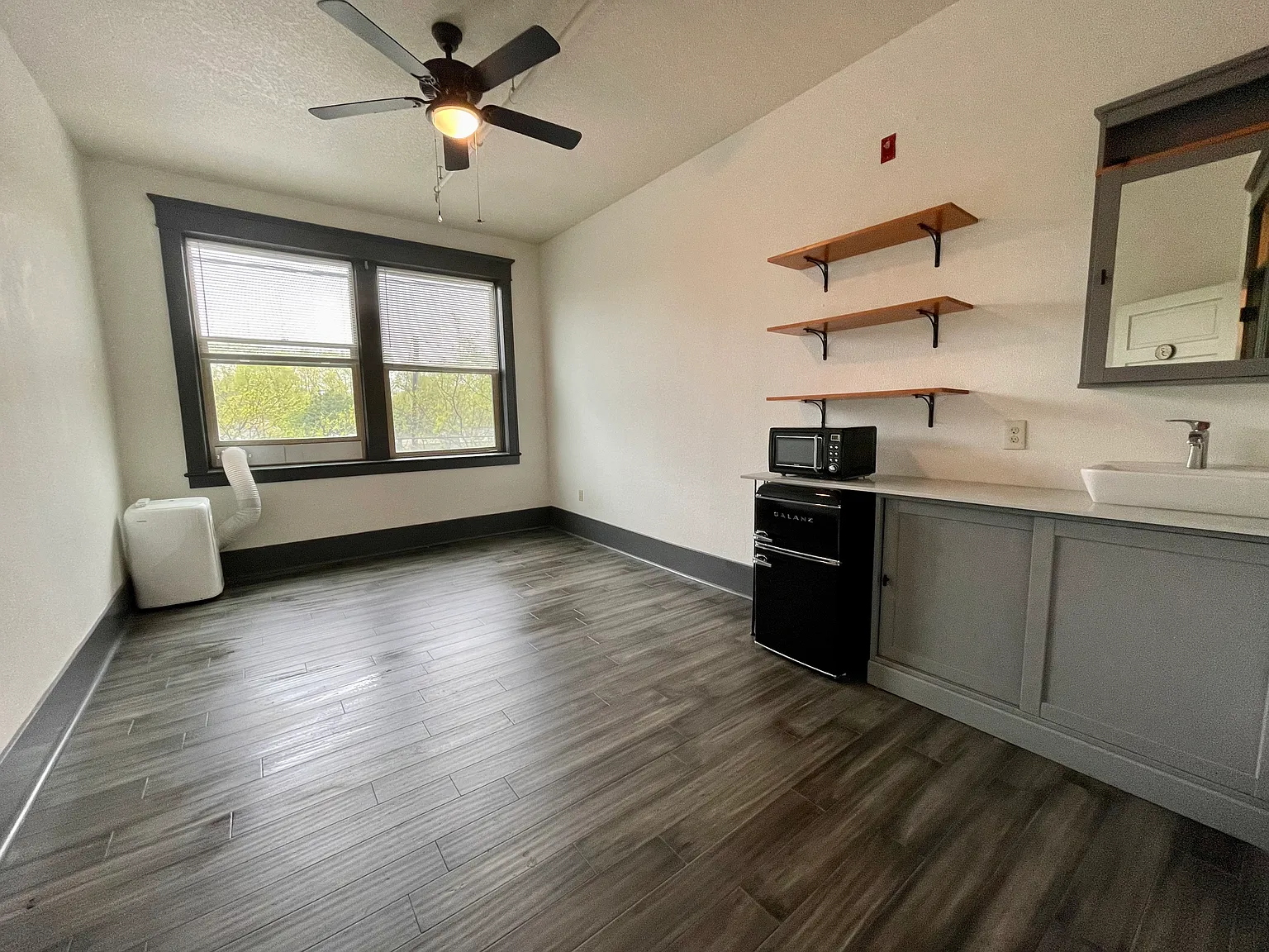 Charming 200 sq. ft. bedroom / apartment in Kenton. (8212 N DENVER AVE - UNIT 3) Best suited for someone seeking a minimalist, low-maintenance space. Compact floor plan with limited storage. Ideal for a quiet, responsible tenant looking for efficient living in a peaceful building. Please note: unit is not designed for multiple occupants. Be surrounded by history and design elements inspired by the beauty of the Pacific Northwest, with beautiful high ceilings, wood flooring, and clear fir and tile accents throughout. Paul Co-Live is located in historic Kenton, a vibrant and growing neighborhood in the Portland Metro area. In addition to all that Portland and the rest of Oregon have to offer, you'll find restaurants, shops, bars, Kenton Park, a seasonal farmers market, annual street fair, and a light rail station - all about 1 block from your front door. CONVENIENCES INCLUDED WITH YOUR RENT: - IN-UNIT KITCHENETTE.....sink, medicine cab, fridge, micro, cabinet, shelving - SHARED GOURMET KITCHEN......fully stocked with cookware, and ample accessories - SHARED BATHROOMS......2 bathrooms, 2 shower rooms, stocked and cleaned twice weekly - HI SPEED WI-FI......no need to pay for your own service - it's included - WEEKLY CLEANING......common areas professionally stocked and cleaned weekly (free coffee included!) - UTILITIES......no setting up and splitting utilities with roommates every month - it's all included - LOW MOVE IN COST...... $500 security deposit and $35 app fee - FLEXIBILITY..... flexible lease terms 3, 6, or 12 month lease your choice - WASHER/DRYER......free use of large washer and gas/steam dryer (steps away on same floor - no stairs!) - SECURE......code access entry and security camera coverage - LOUNGE.....TV and tunes in a cool and cozy fully furnished space - GRILL COURT......grill a burger year round, or hang by the fire pit - SUN DECK......furnished shared deck for sun fun DETAILS: PARKING - street, no permit required PETS - cats ok with $25/mo prrrr cat SMOKING - non smoking property TERMS - 3/6/12 months MOVE IN - $500 deposit, / $35 screening ACCESSIBLE UNITS: no RENTAL CRITERIA: available upon request SEE DESCRIPTION