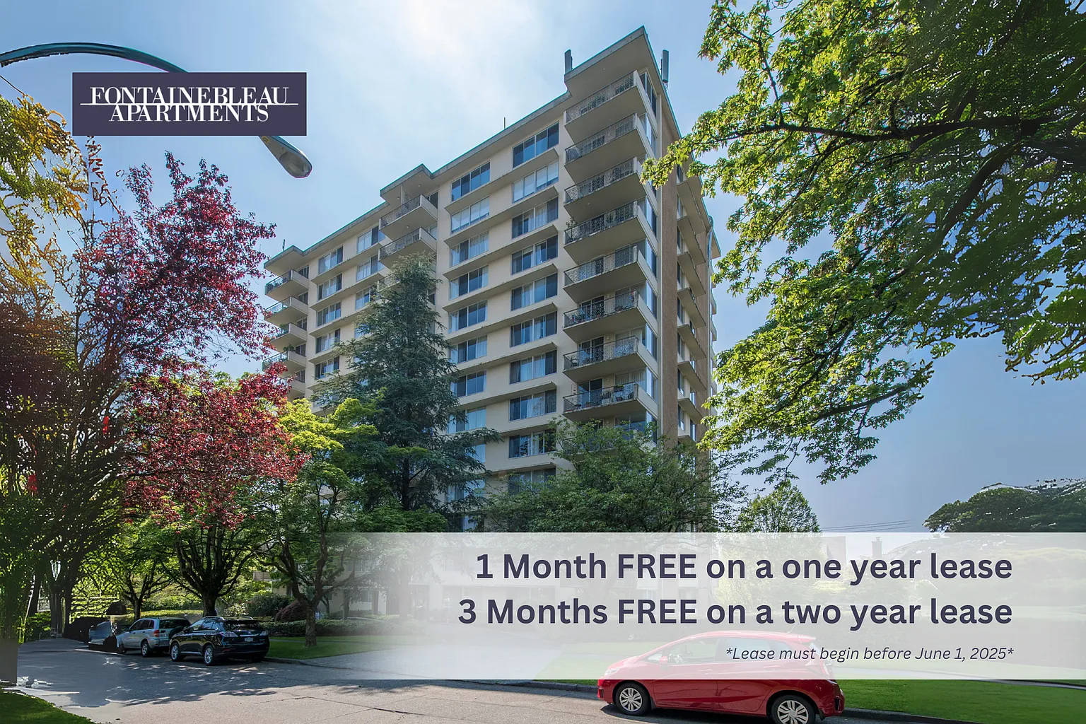 SPECIAL OFFER: 1 Month free on a one year lease; 3 Months free when signing a 2 year lease (Lease must begin before April 1, 2025) Secluded in the peaceful and sought-after Kerrisdale neighborhood, Fontainebleau Apartments offer a serene living experience in the heart of Vancouver's west side. This 13-storey high-rise, situated at the tree-lined corner of Balsam Street and West 39th Avenue, provides residents with spacious and thoughtfully designed 1, 2, and 3-bedroom pet-friendly rental homes, each featuring generous-sized layouts, upgraded kitchens and bathrooms, and bright balconies to enjoy the greenery. Whether you're relaxing on your private balcony or exploring the neighborhood, Fontainebleau is a place where comfort, convenience, and a sense of community come together.Apartment Features: Fontainebleau Apartments are designed for modern living with spacious layouts and stylish finishes. Recent updates ensure these homes are both comfortable and functional:- Hardwood floors throughout, offering timeless appeal- Bright balconies to enhance your living space with fresh air and city views- A full kitchen and bathroom- Spacious bedrooms with large closets and wall-inserted cabinetry for added storageBuilding Amenities: At Fontainebleau Apartments, enjoy an array of amenities designed for your comfort and convenience:- Two saunas/steam rooms to unwind and rejuvenate- Laundry rooms on every floor, each equipped with a sink, washer, and dryer for your convenience- Party/amenity room with kitchenette, perfect for social gatherings- Secured parking for peace of mind- Storage lockers (subject to availability)- On-site building manager to ensure smooth day-to-day operations