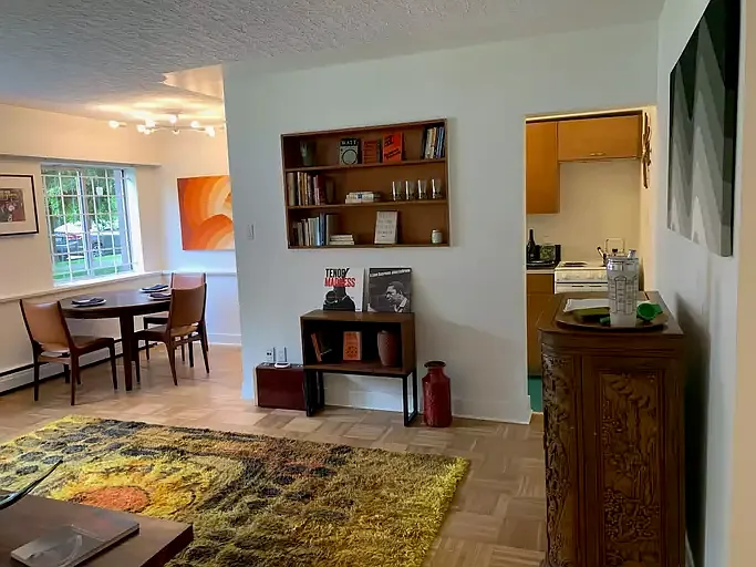 Our analysis highlights renovated mid-century apartment, vintage kitchen, and parquet floors as key attractions of this home.