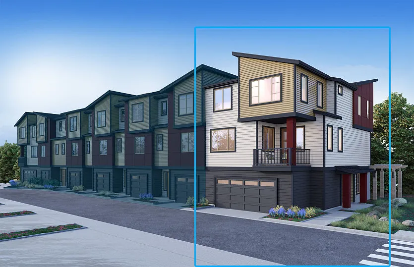 Residence V is a corner townhome unit with stairless entry on the main floor. The main living area includes a café with deck access, kitchen with island, and gathering room with convenient art niche. The bottom floor has the 2-car side by side garage plus 4th bedroom with full bath. The top floor houses 3 bedrooms including the owner's suite with dual vanity and oversized walk-in closet.
