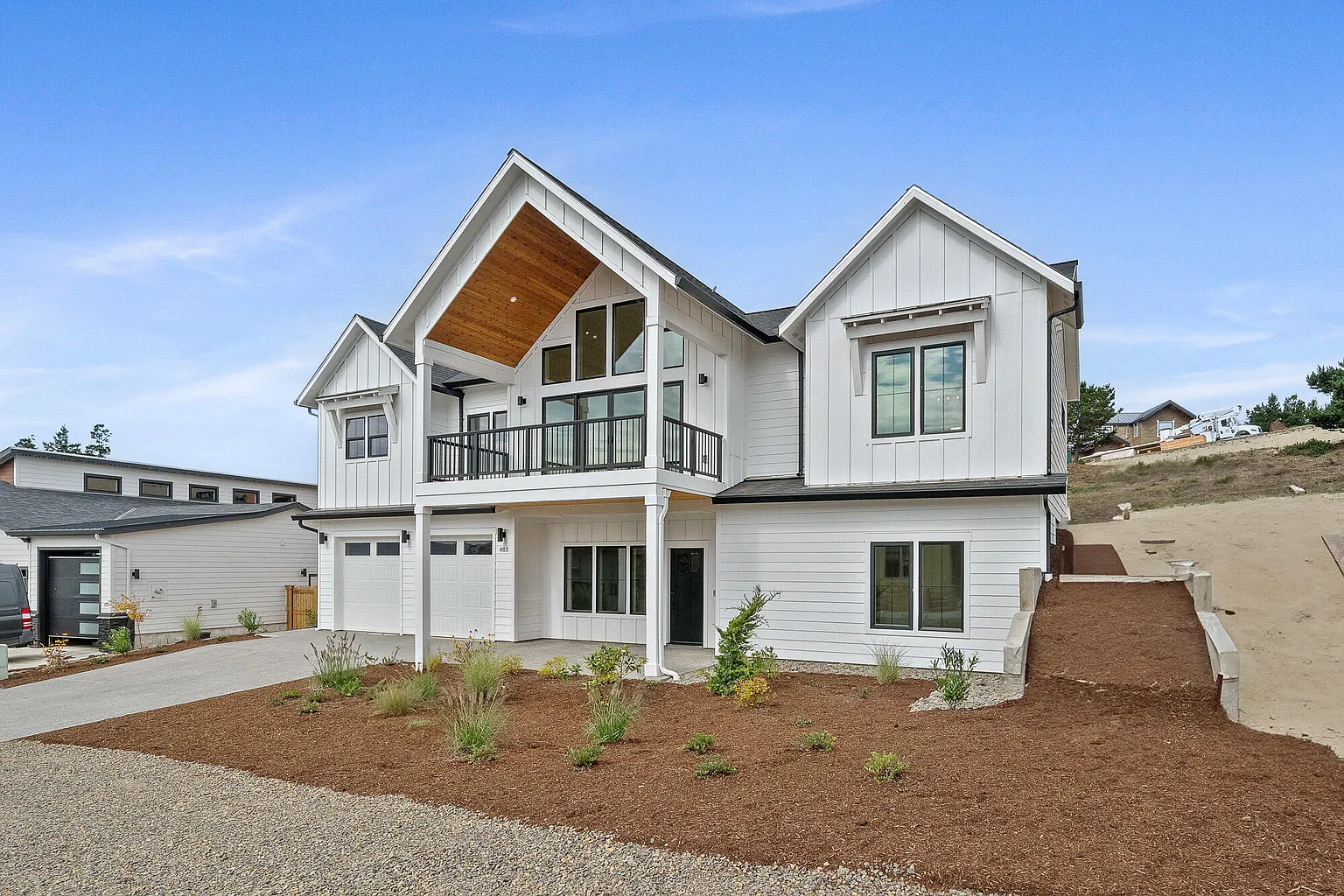 Move-in ready, newly constructed modern coastal home in the desirable Highlands at Manzanita, offering approx. 2,300 sq ft of flexible living space & quality finishes. The reverse floor plan features two distinct living rooms, ideal for guests or media space. The upper level showcases a vaulted great room with a striking gas fireplace, flowing to a covered deck, plus a primary suite with large bathroom. The kitchen features quartz counters, modern finishes and a distant view of the Nehalem Bay. Durable LVP flooring is designed for coastal wear and tear. The lower level includes 2 bedrooms, a full bath, and the second living area. Positioned next to common space on two sides, this home enjoys a rare buffer and added privacy. Convenient to town and beach and ready for its first owner. Call your broker to schedule a viewing.
