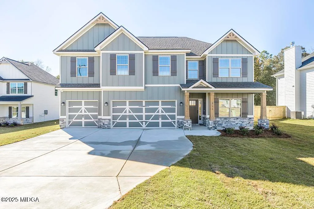 A charming Hughston Homes community nestled in the heart of Bonaire, Georgia, Magnolia Flats has everything you need to make your home truly feel like home! The Belmont A plan is a Favorite with 3158 SF of Living Space. Entry Foyer, Formal Dining, Spacious Great Room, Luxury Kitchen & Breakfast Area, Media Room, 5 Bedrooms, 3 Baths, THREE Car Garage & Signature Gameday Patio perfect for Outdoor Entertaining! Many Included Home Automation Options and Tons of Included Luxury Features! Two Story Entry Foyer, Formal Dining w/ Coffered Ceilings & Wainscotting. Spacious Great Room w/ Wood burning Fireplace. The Gourmet Kitchen includes Ample Quality Cabinetry, Quartz Countertops, Herringbone Tiled Backsplash, Built-in Stainless Appliances, Gallery Gas Cooktop, Single Wall Oven, Built-in Microwave, Stainless Vent Hood, & Luxury Dishwasher! Large Kitchen Island, Breakfast Area & Walk-in Pantry for additional Storage. Owner's Entry w/ our Signature Drop Zone. 5th Bedroom & Full Bath conveniently located on Main Level. Upstairs leads to an Expansive Media Room, perfect for 2nd Living Area. Huge Owner's Suite w/ Sitting Area, Owner's Bath w/ Tile Shower, Garden Tub, Vanity w/ Quartz Countertops & Gigantic Walk-in Closet. Additional Bedrooms are Spacious & Bright. THREE Car Garage & Signature Gameday Patio perfect for Outdoor Entertaining! Tons of Included Features, such as Spray Foam Insulation, Gas Tankless Water Heater, 2' Blinds on Front of the Home, Gourmet Kitchen, our Signature Gameday Patio & Quality Craftsman Style will set us apart.