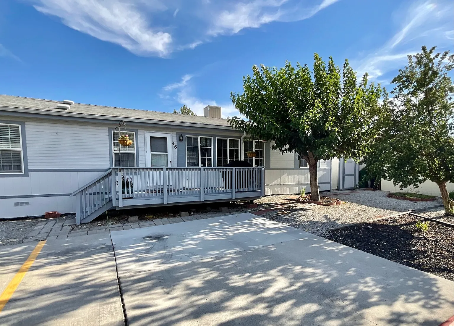 Welcome to this well maintained 3 bed, 2 bath manufactured home. Inside, the spacious living area features vaulted ceilings and textured walls, creating a light and open atmosphere. Natural light flows through the large windows, highlighting the warm tones and welcoming layout. The kitchen is equipped with generous cabinet space, a practical layout, and a convenient breakfast bar that connects seamlessly to the dining area and living room. The home is designed for year-round comfort with evaporative cooling and ceiling fans to help keep the space temperate. The primary bedroom includes a full ensuite bathroom, while the secondary bedrooms offer flexibility for a variety of uses. A separate laundry room provides additional convenience. Outside, the front deck offers a pleasant place to enjoy the outdoors, with gutters to help keep the home protected. A storage shed adds practical storage solutions, and the mature trees around the property provide shade and natural beauty. With off-street parking, a low-maintenance yard, and a thoughtfully designed interior, this home is ready for its next chapter. Come see what makes this property a special place to call home.