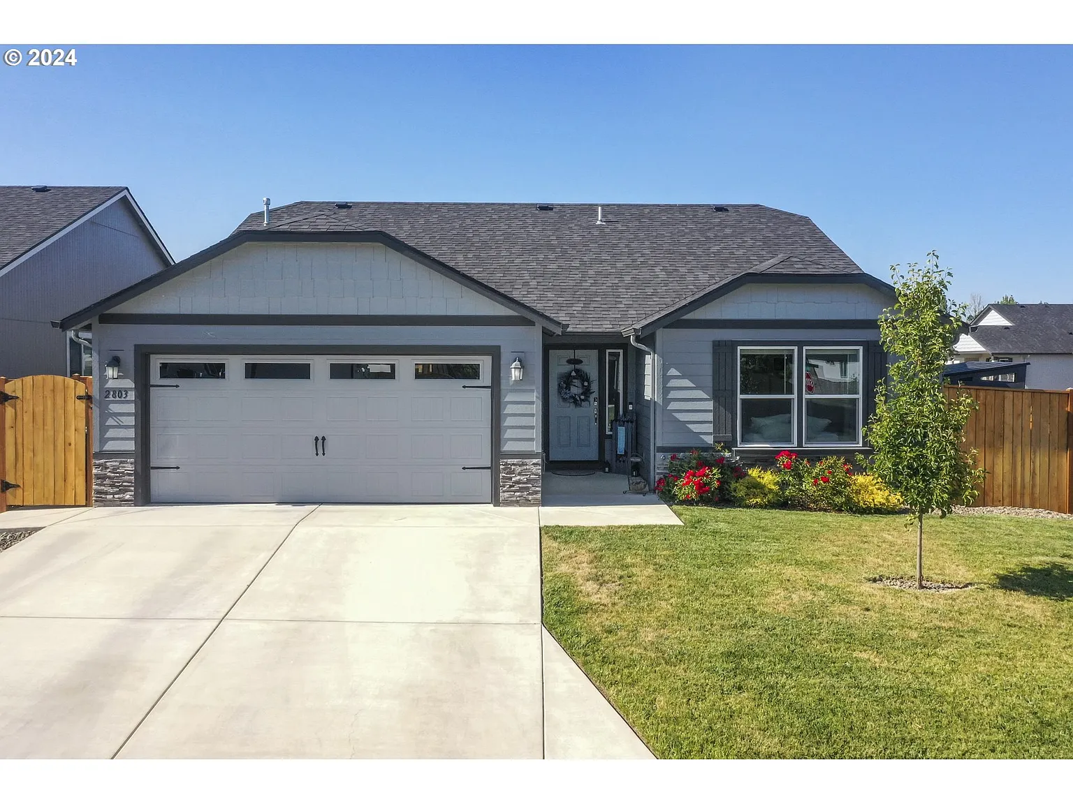 Impeccably maintained 2022 built Hayden Home perched on great corner lot in the most sought out area of Albany. Pre-inspection report on file and Choice Home Warranty provided with sale! Inviting entryway leads to an open floor plan with luxury vinyl flooring throughout and tons of builder upgrades. Stylish kitchen features high ceilings, breakfast bar, gas range, stainless steel appliances, custom cabinets with lighting, tile backsplash, pantry, and ample quartz countertops. Spacious living and dining make their way to the private fully fenced backyard with pergola structure, double wide concrete patio, RV parking and newly planted fruit trees. The separate main suite affords you privacy and features two large closets in addition to a custom raised dual vanity and upgraded glass door shower ensuite. The two sizable bedrooms - one of which may be used as an optional den - share a full bathroom with raised vanity. Centrally located laundry room for ultimate convenience. Fully finished insulated garage features upgraded LED lighting and tons of space for workout room or man cave. Schedule a private showing today!