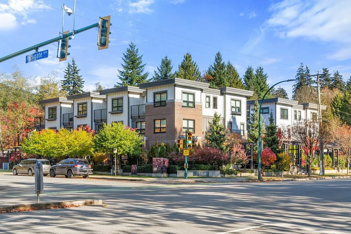 Beautifully built 3BR, 2.5BA Brownstone-style townhome in North Vancouver. 5-min walk to Parkgate Village for groceries, the library, and community centre.Surrounded by Deep Cove, Cates Park, Mount Seymour & Northland Golf Course, ideal for outdoor enthusiasts. Features open-concept living w/ 9' ceilings, SS gas range, and Mitsubishi heat pump for year-round comfort. Top floor master BR includes large ensuite, walk-in closet & private balcony. Enjoy gated patio w/BBQ gas hookup, 2 side-by-side parking stalls and large storage locker. Only 20/30 min to Burnaby/Downtown, offering the perfect balance of nature, comfort and convenience