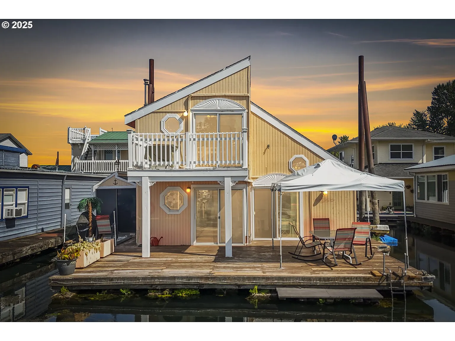 Opportunity awaits for you in an owned slip moorage to make this cute cottage your own! A location close to the ramp yet off the main access walk provides a level of privacy sans a long journey & Islands moorage has wide river spaces between the rows for easy navigation & lower density atmosphere. Capture sunset & Government Island views from the balcony & the main level deck has ample covered and uncovered spaces for year round access & river enjoyment. Built in 1979' the home features 1090sf of living space on 2 levels in a unique cottage contemporary design, indicative of the era built & mid-late 70's designs. The main level has a bedroom pier side with ample closet space & a full bathroom just inside the foyer. The staircase just inside rises within the vaulted space & the river side of the main level is akin to great room layouts found in newer homes with the kitchen, dining nook, & living room near open to each other. A stackable washer & dryer is nestled into a pantry / utility closet and the kitchen lives large with open space & smart layout given the homes' size. The cozy living room has big views via sliding glass door to the river & a gas fireplace will warm you in the cooler months. A mini split system provides efficient AC & serviced recently. The upper level has a relaxed family room with slider to an upper balcony to take in sunsets to the west, & island views to the NW. A second bedroom on the upper level is spacious & has a good sized closet and additional unfinished attic storage. Ceiling fans through keep the air moving & temps as desired. Light remodeling, cosmetic updates, fixture and surface updates all await the next owner to make this comfortably sized contemporary cottage their own at an affordable price! Gated and secured with ample guest parking, low monthly dues, & a well maintained moorage will complete your river centric lifestyle! **Carpet on main replaced and interior painted following initial photo shoot; additional photos incl
