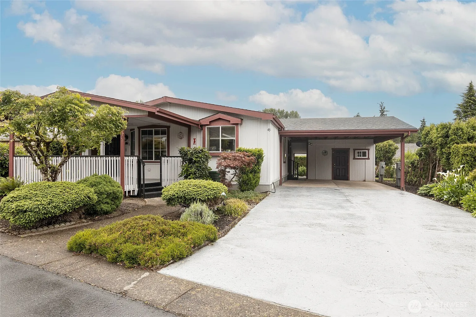 Oak Haven #43, your next chapter starts right here in this PRIVATELY owned, 55+ community. 1268sqft, 2 bed/2 bath, large workshop, open-concept layout, primary suite is a peaceful retreat with a private bath and plenty of closet space for all your favorite outfits (and then some!). Updates include fresh interior paint & new kitchen flooring, skip the projects and jump straight to enjoying life. Outside is a covered carport, huge driveway, raised garden beds & a low-maintenance yard, translation - more time for happy hour & less time pulling weeds. Tucked in a well kept park near everything (yes, Costco and coffee are super close) space rent $755, friendly neighbors and just enough home to keep life simple and affordable. Welcome Home!