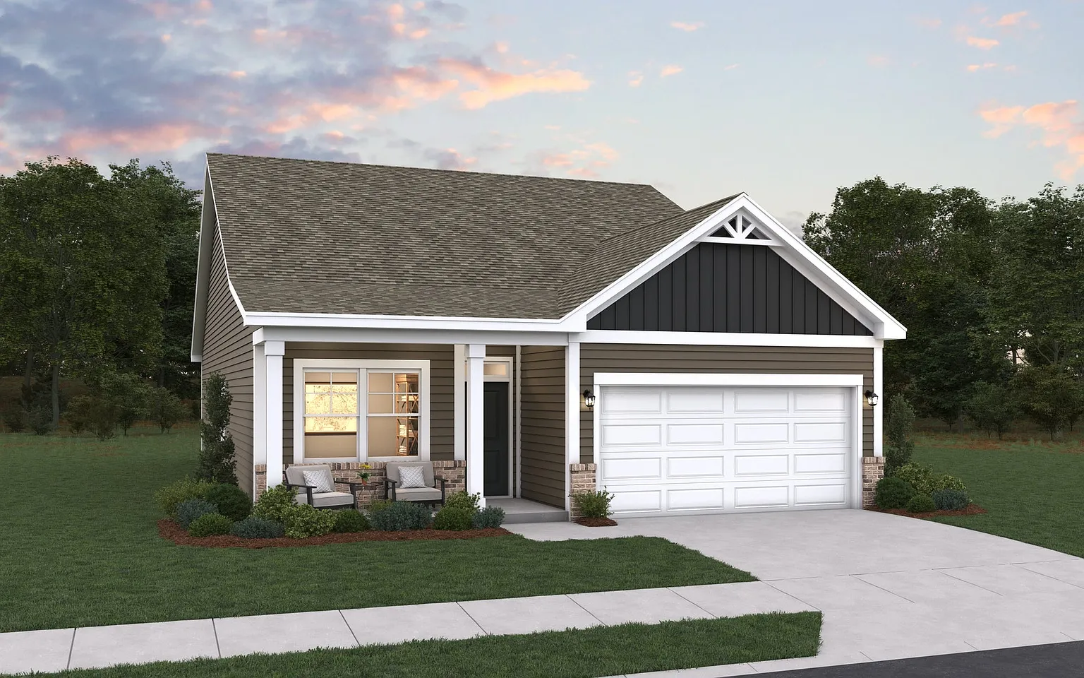 The Cascade floor plan is a well-designed one-story home offering 1,604 square feet of comfortable living space. This layout features a study, providing a perfect space for a home office or flex room. The open floor plan seamlessly connects the kitchen, dining, and living areas, creating an inviting space for both daily living and entertaining. With its convenient single-level design and thoughtful layout, the Cascade floor plan is ideal for those seeking easy living with modern amenities. Images are representative of the Cascade plan.