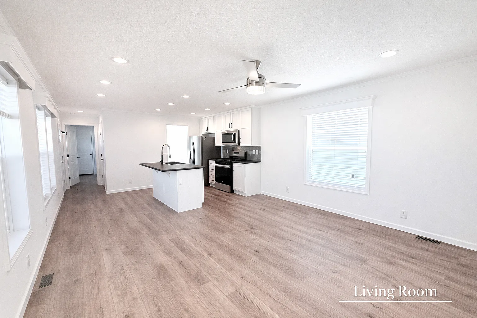 A chef-inspired kitchen with an oversized island creates the perfect setting for morning coffee, casual conversations, and effortless entertaining in our premier 55+ single family subdivision in Channahon. The kitchen island seats 3, with a beautiful stainless steel farm sink and dishwasher.... The white wash wood cabinetry pops with it's black hardware... the subway tile is a great addition-paired with stainless steel appliances.... The living room is an open concept with seamless European oak flooring.... Just off the kitchen is the laundry room with gas & electric dryer connections and matching cabinetry and wire shelving. This home is equipped with the following: -Gas Stove -Refrigerator -Dishwasher -Above the Range Microwave -Gas Forced Air Furnace -Central Air Conditioning -Two Wooden Entrance Decks -Two Car Driveway The private primary suite is tucked at the rear of the home with an oversized king size + bedroom with large window, huge walk in closet with shelving and perfect master bathroom with glass barn door shower with calcutta marble like enclosure. While two front bedrooms offer ideal flexibility for guests, hobbies, or a home office. With quiet streets, a private driveway, and the option to add a garage, this home is built for comfort, ease, and everyday simplicity. Remington Woods: Beautiful homes. Quiet streets. Peaceful living. $900 Monthly site fee does include your property taxes, and access to our beautiful clubhouse!