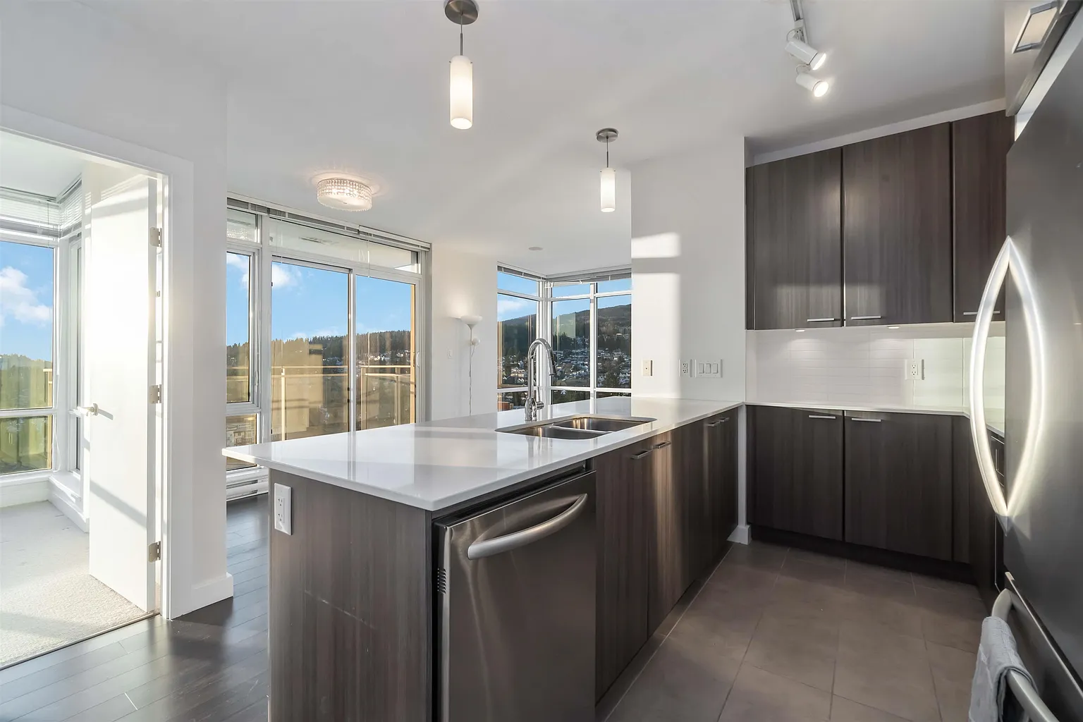 Rare 19th floor NW corner unit with unobstructed panoramic mountain views and stunning sunsets. Bright 820 sq ft home with floor-to-ceiling wrap-around windows and two bedrooms on opposite sides for privacy. Original owner since 2012, never rented, meticulously maintained and move-in ready. Quality finishes include KitchenAid stainless steel appliances with gas cooktop, stone countertops, and in-suite laundry. Includes THREE storage lockers. Resort-style amenities with low strata fees. Steps to Lincoln SkyTrain Station and Coquitlam Centre. Exceptional opportunity in a high-demand building. Open House March 22st 12-2pm