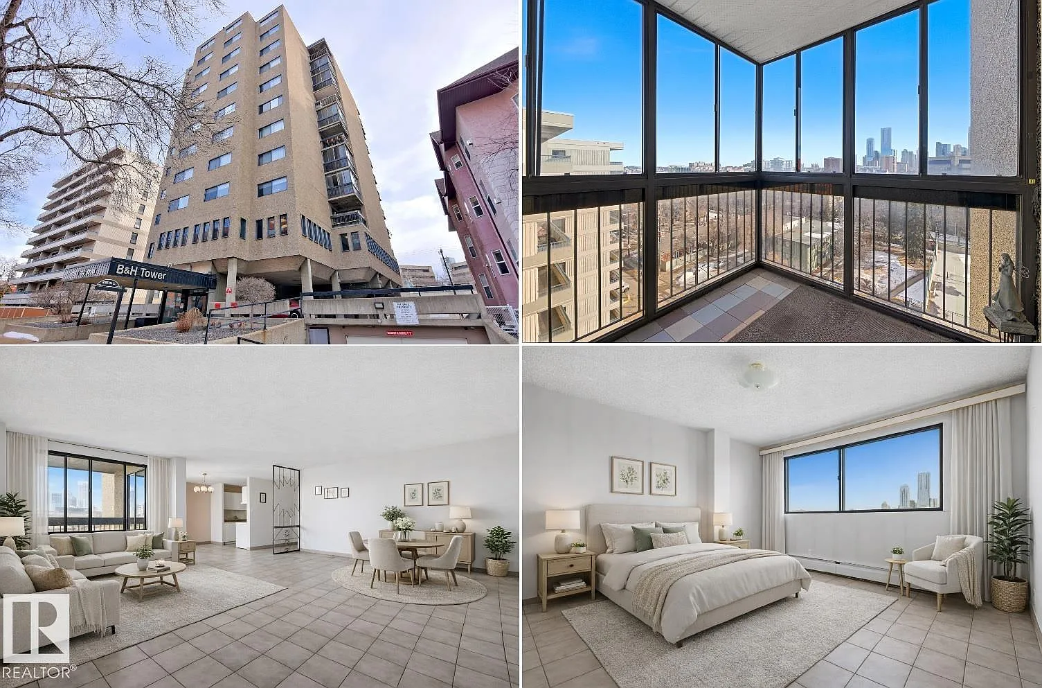 YOUR DOWNTOWN LIFESTYLE AWAITS! This spacious 2 bedroom & 1 bath concrete 8th floor condo in the B & H Tower is perfect for students, professionals or couples. Main features are: 1,128 sq.ft. of living space, large living room, efficient galley kitchen and generous dining area with sliding doors to a fully enclosed balcony with an awesome view of Downtown! Extra bonus: sink in the primary bedroom, easy care flooring throughout, in-suite laundry, visitor parking and extra storage. You will enjoy an underground parking stall and ALL utilities which are included in condo fees. This fantastic location will be your epicenter to Brewery District, Rogers Place and the Downtown core with all the shops, galleries and fine dining. Quick access to Grant MacEwan, U of A and NAIT via ETS and LRT. Note: some photos have been virtually staged. MOVE IN READY WITH QUICK POSSESSION!