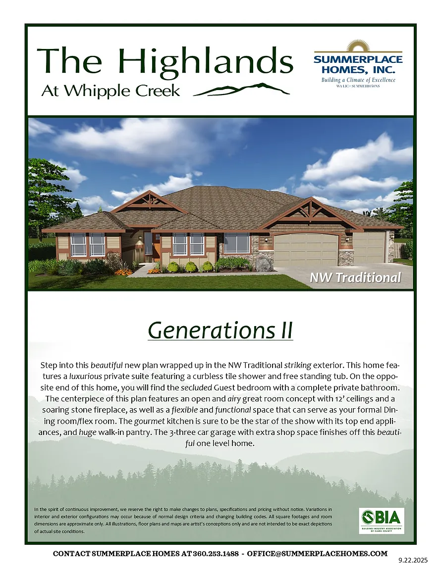 Step into this beautiful new plan wrapped up in the NW Traditional striking exterior. This home features a luxurious private suite featuring a curbless tile shower and free standing tub. On the opposite end of this home, you will find the secluded Guest bedroom with a complete private bathroom. The centerpiece of this plan features an open and airy great room concept with 12' ceilings and a soaring stone fireplace, as well as a flexible and functional space that can serve as your formal Dining room/flex room. The gourmet kitchen is sure to be the star of the show with its top end appliances, and huge walk-in pantry. The 3-three car garage with extra shop space finishes off this beautiful one level home.