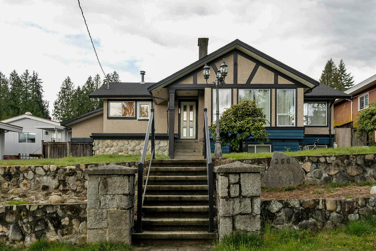 Enjoy fantastic panoramic views from this calm, quiet street. This 1960 Tudor-style home spans a 7,800 sqft lot with 2,490 sqft of living space, featuring 4 bedrooms and 2 bathrooms. Three bedrooms are located upstairs, while downstairs offers a lock-off one-bedroom suite, a rec room, and a flexible utility space—ideal for multigenerational living or rental income. The property includes a pool, pool house, and covered deck, along with an attached shed/utility room and ample parking, offering excellent potential for future upgrades. Sold as-is, this home presents an exceptional opportunity for renovation or new construction to create your dream home.