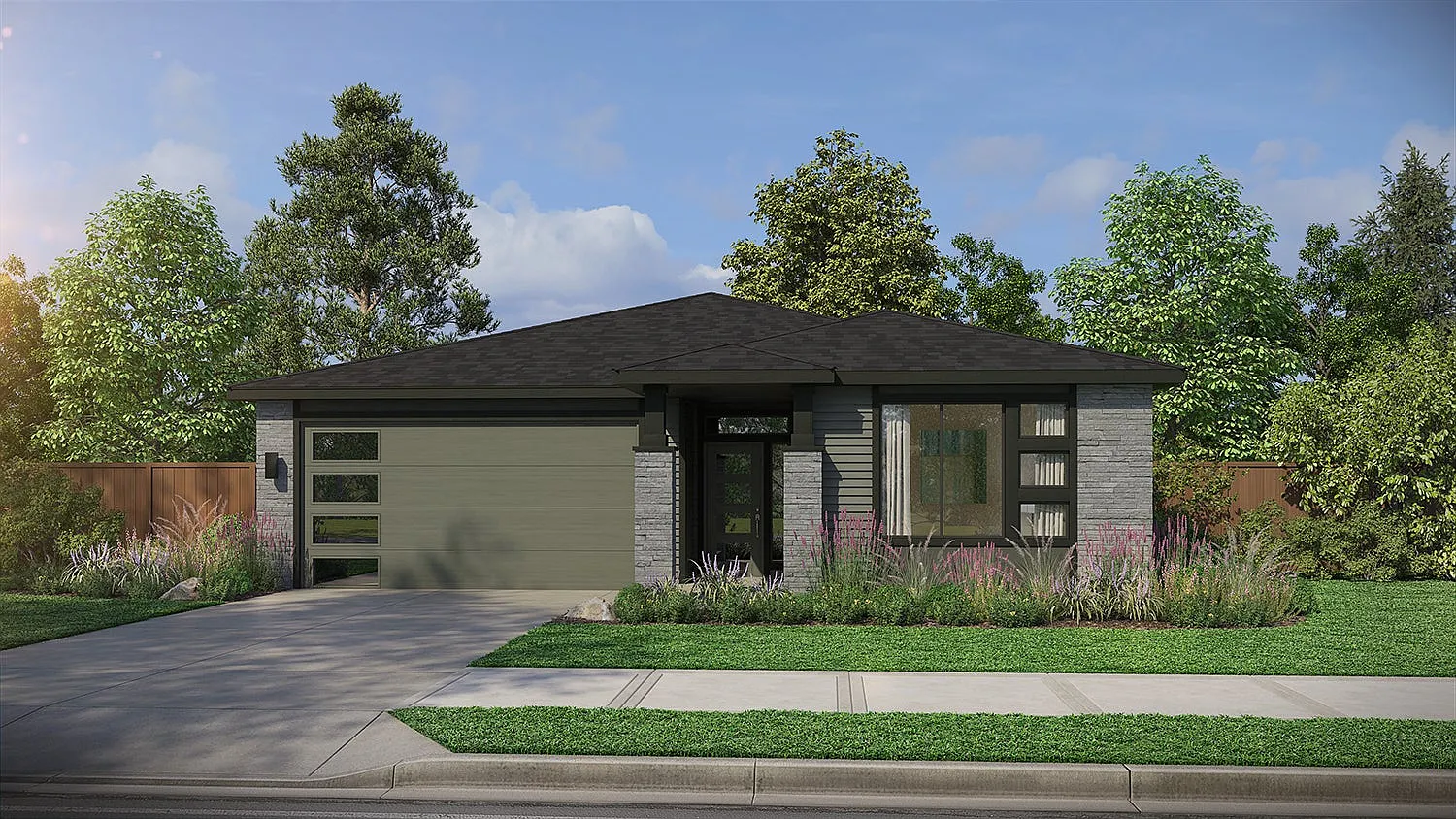 The Deschutes home plan is a thoughtfully designed 1,912-square-foot single-level home offering 3 bedrooms and 2 bathrooms, blending efficient living with open, light-filled spaces. This plan is ideal for homeowners seeking comfort, functionality, and a modern layout that lives larger than its footprint. Upon entering the home, you're welcomed by 9-foot ceilings and a well-organized entryway that provides access to the two guest bedrooms and a full bathroom. One of the guest bedrooms includes a walk-in closet, adding extra storage and flexibility for guests or family members. Continuing down the hallway, you'll find a spacious laundry room that conveniently connects to the 2-car garage, with the option to add a third car bay depending on the homesite. The heart of the home opens up to an inviting great room with 11-foot ceilings and large windows that bring in abundant natural light. The kitchen flows seamlessly into the great room and features generous counter space and a spacious pantry, making it perfect for everyday living and entertaining. The dining area is thoughtfully connected to both the kitchen and great room and offers direct access to the included covered patio through a sliding glass door, creating an easy indoor-outdoor connection. Privately located on the opposite side of the great room, the primary suite offers a peaceful retreat with a large bedroom and a flexible, spa-inspired bathroom. Homeowners can personalize the space with multiple bath...