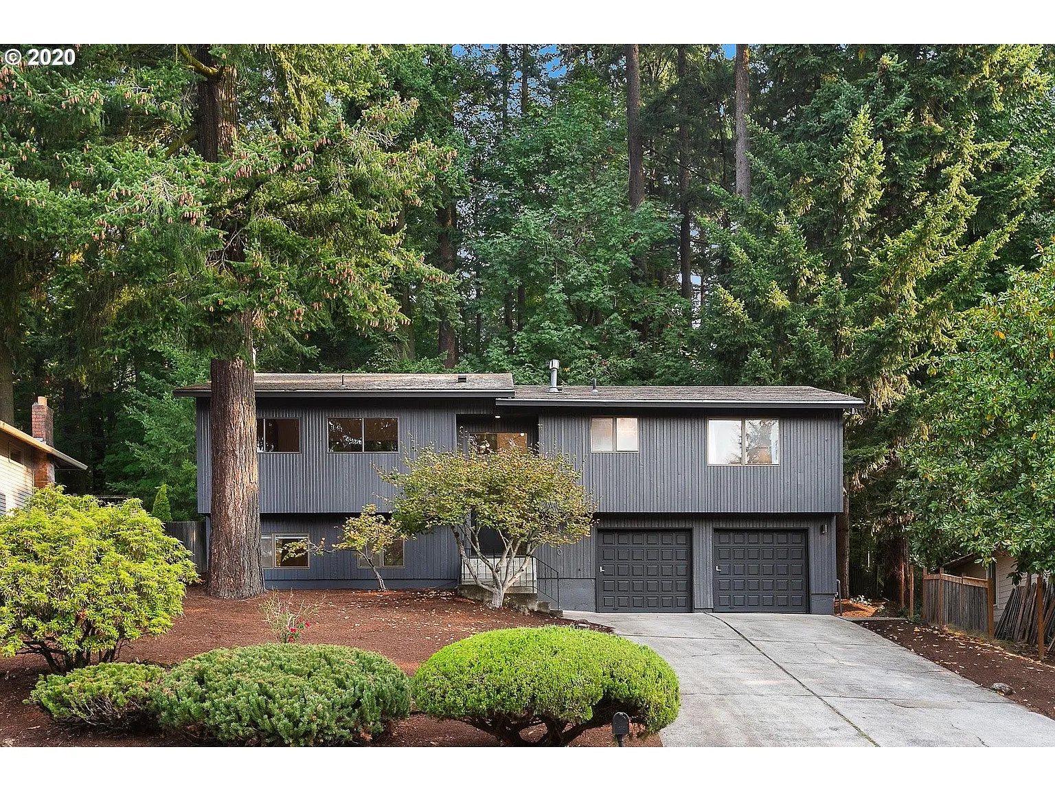 Stunning Happy Valley home with beautiful views of natural green space and city lights! Updated with premium grade hardwood floors on main floor. Great room with wood beam vaulted ceiling, fireplace & built-in storage/bar area with sink. Kitchen has custom cabinets & Corian counters. Potential for in-law suite on lower level with full bathroom, bedroom, second living room & fireplace.