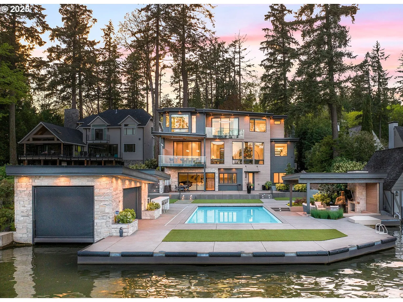 Luxuriate in the pristine Oswego Lake lifestyle with an award-winning builder's impeccable eye for contemporary comfort, miles of sparkling water vistas, and superb entertaining in this perfectly positioned modern masterpiece estate. The gated, private driveway opens to a private lake level parcel with destination 30x20' pool plus spa, outdoor kitchen, fireplace, outdoor shower, heated patio, dock, and boathouse with lift and custom rising floor. The dazzling interiors feature floating staircase, a 3-stop elevator, leathered quartzite counters, plank flooring, walls of lake view windows, full bar and glass-walled wine room, and a vast party room with wall of slide-away doors opening to lake side entertaining. Jaw-dropping at every turn, yet elegantly understated, this destination Oregon luxury oasis leaves no desire unmet! Showcase great room kitchen featuring hidden pantry and veranda, primary suite with lake view soaking tub, dressing room, and private balcony, fitness studio with Finlandia sauna, and collector's 3 car epoxy garage. Equally at home as your personal haven away from it all or as an unforgettable celebration space, Oswego Lake's leading new contemporary offering reinvents Oregon world-class waterfront living!