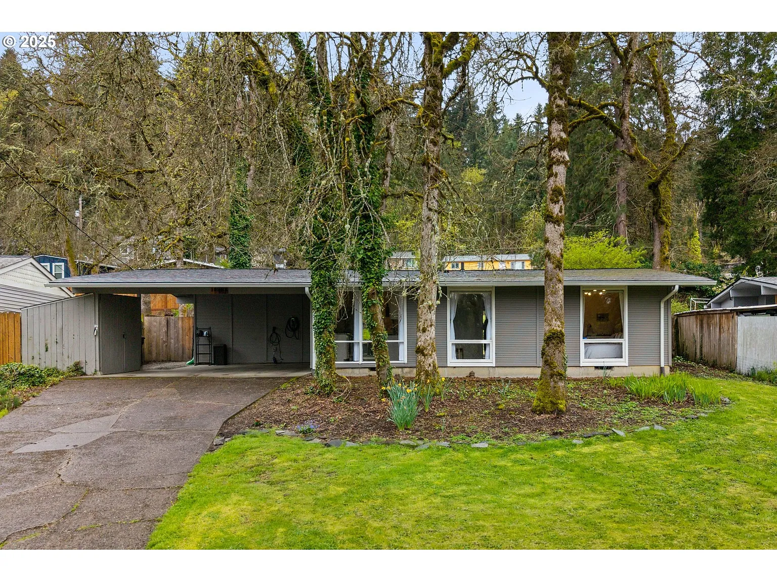 Rare affordable one level in West Linn. Hurry on this mid-century modern gem. Optimal floor plan with 3 bedrooms and 2 full bathrooms. Lives large with vaulted ceilings and floor to ceiling windows throughout. Remodeled kitchen with shaker cabinets, granite countertops, tile backsplash, stainless steel appliances and gas range. Updated bathrooms with stylish tile details, newer lighting and vanities. Large fully fenced private backyard with deck and shed. Spacious 2 car carport with 250 kW EV charger and extra storage space. Newer composition roof and newer electric panel. A+ location across the street from Mary S. Young Park and the Willamette River. Near shops, dining, and highly rated schools.