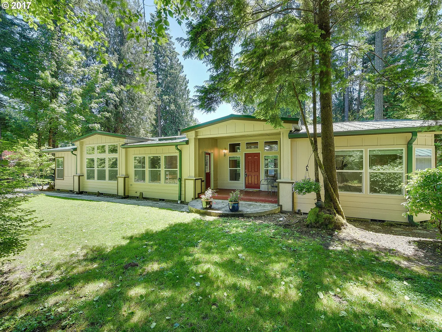 Spectacular close-in & private .65 acre Salmon Riverfront lot with 2747 sf '03 tri-wide in excellent condition, minutes to Sandy Ridge trails, fishing & golf, 30 minutes to Mt Hood skiing. One level living, 4 bdrm (two master suites), 3 full baths, large kitchen, wdstove, 2015 new roof, decks, river views; gorgeous sunny location amongst towering firs. Small outbldg/studio, wd storage, garden shed, ample parking & more.