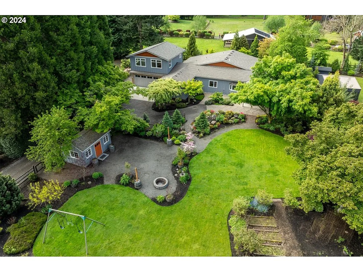 Nestled in one of West Linn's most esteemed neighborhoods, 200 Peach Cove Lane offers an unparalleled sanctuary, just moments away from the Oregon Golf Club, Hebb Park, and the enchanting West Linn wine country. Set upon a park-like acre of land, the approach to this residence is nothing short of enchanting, with a tree-lined driveway welcoming you to your private retreat. Immersed in the beauty of nature, the extensive landscaping surrounding the home sets the stage for serene relaxation, while a spacious lawn with a studio provides the perfect backdrop for entertaining guests. This 5-bedroom, 4-bathroom home has been thoughtfully updated to cater to discerning buyers seeking the epitome of custom home living. Step inside to discover a remodeled kitchen and walk-in pantry, alongside newer additions including two bedrooms above the garage. Modern comforts abound, including a tankless hot water heater, water treatment system, storage sheds, and ample space for RV or boat parking. Upon entering the grand foyer, natural light floods the home, highlighting the meticulous attention to detail evident in every corner. The kitchen effortlessly flows into the adjoining sitting and dining areas, creating an ideal space for hosting large gatherings. Continuing into the great room, access to covered outdoor space beckons, offering the perfect venue for barbecues or leisurely evenings spent under the stars. The coveted primary suite on the main level boasts a luxurious spa-like bathroom and expansive windows adorned with plantation blinds, providing both privacy and breathtaking views of the backyard.Two additional rooms on the main floor, along with two more upstairs, offer endless possibilities for living arrangements. Experience the ultimate in relaxation and luxury at this exceptional property, where every day feels like a vacation. Welcome home to 200 Peach Cove Lane!