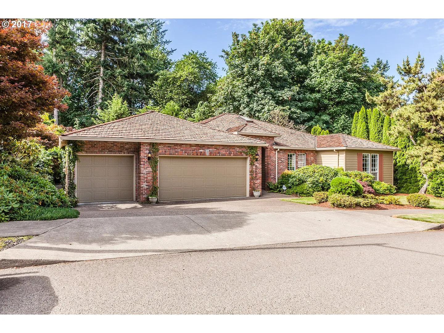 1 Level - Great Room Floor Plan - Has 2 Master Suites! Gorgeous kitchen. Wonderful peaceful setting - Backs to green space. Nice outdoor space with large patio plus a large 15' X 50' deck. Three car garage & AC! Wide hallways. Cedar shake roof, brick & hardiplank exterior. Built-in vacuum & surround sound. Shows pride of ownership....