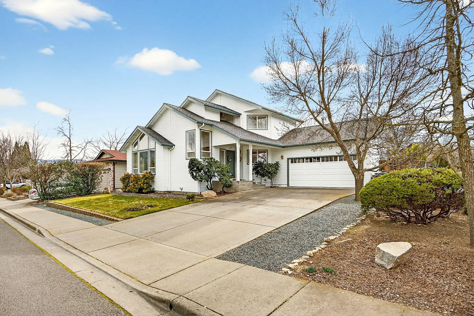 Light-filled & well-maintained 2-story home in the desirable Oak Knoll Meadows, ideally located on a landscaped corner lot w/ mountain views. This inviting 3-bed, 2.5-bath home features a spacious great room w/vaulted ceiling, expansive windows & a gas fireplace. The sunny kitchen & dining area overlook the great room, ideal for everyday living & entertaining. A main-level primary suite offers a peaceful retreat w/dual vanities, walk-in closet, & shower. Upstairs, open landing overlooks the living space, while 2-guest bedrooms & a full bath provide room for family, guests, or home office. Additional highlights include separate laundry rm, 2-car garage w/ yard access & spacious deck for outdoor entertaining. Community open space, trails, & guest parking. Convenient to the YMCA, schools, shopping, golf course, and local wineries, this move-in-ready home delivers comfort & ease.