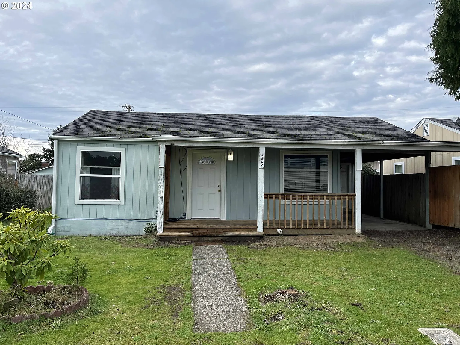 This cozy 2 bedroom, 1 bathroom home is the perfect starter home or investment property! This 880 square foot home features a covered front porch, built-in storage space, FS refrigerator & FS range. Large utility sink in laundry room with vaulted ceilings. Attached carport includes rafters for more storage. Don't miss the sizeable backyard with alley access. Home is being sold in AS-IS condition. Come out and take a look at this property today!