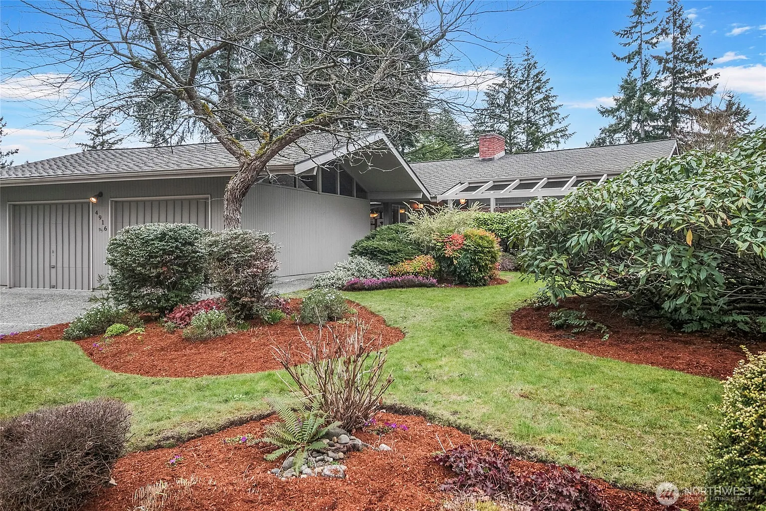 Immaculate mid-century modern rambler in the heart of Newport Hills! This stunning 1964 gem showcases original asymmetric design with natural elements and clean lines. Rich wood-plank vaulted ceilings and expansive windows create a bright, open atmosphere. The spacious living room features a gas fireplace, and the dining room includes an open bookcase with swinging doors to the kitchen—perfect for entertaining. The family room boasts vaulted ceilings, open beam windows, and a sliding glass door to a sculpted yard. Huge garage with vaulted ceilings. New electrical panel with dedicated EV port. Freshly painted and move-in ready! Prime location near shopping, downtown Seattle & Bellevue and in the highly sought-after Bellevue Schools District.