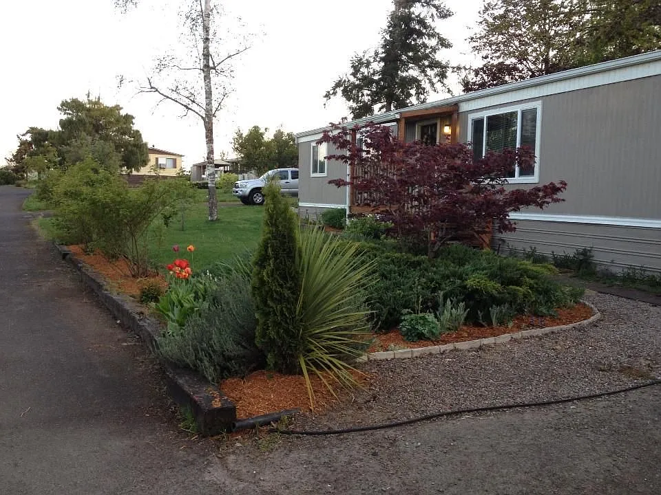 1979 double-wide manufactured home, 1299 square feet, 3 bedroom, 2 bath, plus den/4th bedroom, large kitchen, huge back yard with a half-covered deck (we BBQ year round!) This neighborhood allows large dogs and has lots of kids! Mature landscaping and garden beds, at the end of the neighborhood with views of the floodplane and tall beautiful trees. Space rent includes water/sewer/garbage/recycling and basic cable TV. New Milgard double-pane windows in 2012, outside painted in 2012, back deck rebuilt in 2009, all vinyl floors that look amazingly like wood and tile, yard and two raised garden beds equipped with micro-sprinklers for ease of watering, carport support posts replaced 2013. All appliances come with the house, including washer and dryer. All potential tenants must pass a background check with Knoll Terrace. This community is NOT 55+, all ages welcome! **Note: guest bath tub needs replaced, it has a leak.** Great neighbors and a quiet neighborhood.