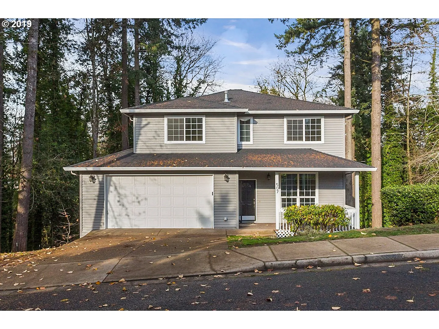 This Oregon City two-story home offers a gas fireplace, stainless steel appliances, a back deck, a covered front porch, and a two-car garage.