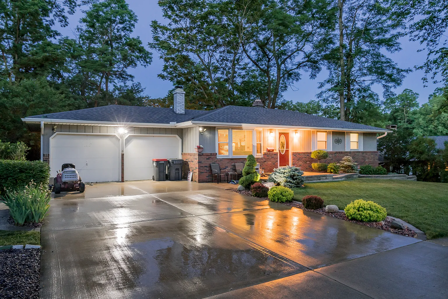 Beautifully newly landscaped Sunset Hills ranch in quiet neighborhood w/ large, private wooded yard. Nice open floor plan with fully applianced kitchen, large fireplaced living room and patio doors that open to nice 3-tiered deck. Large walk-out lower-level family room w/ oversized fireplace and 4th bedroom with half-bath. HE washer/dryer. Many updates: New roof & gutters ???17, water heater ???16, geothermal heating & cooling ???12, driveway & garage floor ???12. 2-car garage with in-floor heating. Walk to parks, schools, lakes, fishing & restaurants/shops. Home warranty with full offer.