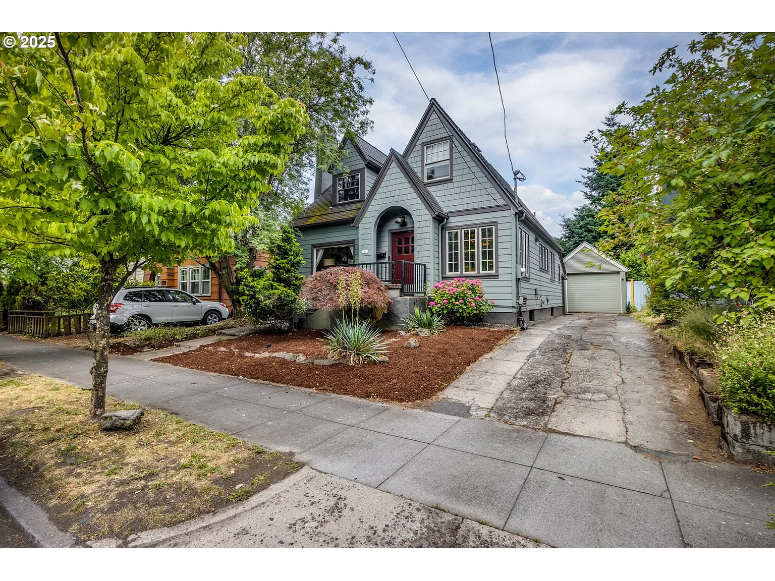 This updated Tudor in the heart of Hollywood stands out with timeless character, smart updates, and an ideal central Portland location. The circular main floor plan connects the spacious living room to the formal dining room and into the kitchen. The remodeled kitchen features quartz countertops, a gas range, eat-in peninsula, and ample storage. A main-floor bedroom opens through French doors to a large deck and fully fenced backyard—perfect for relaxing, gardening, or entertaining.Upstairs, the oversized primary suite and second bedroom offer a peaceful retreat with classic Tudor charm. Enjoy the convenience of two full bathrooms upstairs and down. The unfinished basement provides laundry, storage, and workout space, while the detached garage adds even more storage options and flexibility.Located in the sought-after Laurelhurst and Grant School District and just blocks from parks, restaurants, shops, and transit, this home offers unbeatable access to all things Portland.
