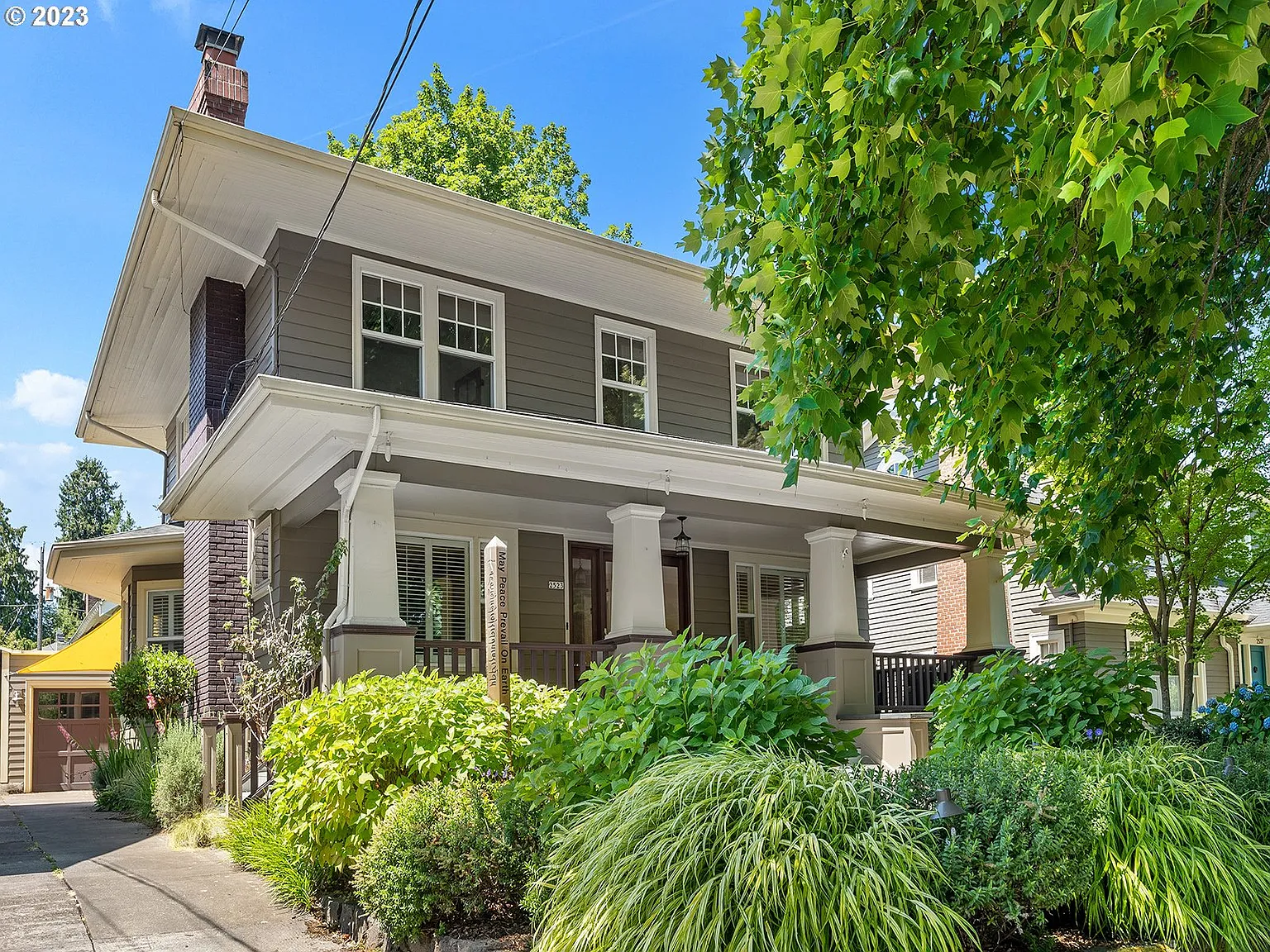 The quintessential Irvington home on a quiet tree lined street. Located blocks from the Broadway business corridor, the Hollywood District, Lloyd Center, Grant Park and neighborhood schools, restaurants and shops. The front yard welcomes you with lush plantings, paved patio, a Peter Wilson dry stack rock retaining wall, garden art, irrigation, outdoor lighting and stairs leading to a large front porch spanning the entire width of the house. Perfect for enjoying summer breezes. Inside, the main floor featuresa long living room and dining room with a wood burning fireplace, plantation shutters and stained glass windows. On the opposite side of the central entryway is an office/study. The central hall leads to a fully remodeled kitchen with plentiful high end cabinetry, a Shaw farm sink, a wolf gas cooktop, built in wall oven, warming drawer and microwave. The large central island incorporates a magnificent marble slab and an additional bar sink. A door lead leads to a deck overlooking the large outdoor fireplace and beautiful plantings.There are 4 bedrooms on the second floor and new oak hardwood floors. Built-in linen closets flank the end of the hallway and the bathroom features dual vessel sinks and a glass doored, tiled shower and heated floor. The basement has been remodeled and has polished concrete floors, exposed raftered ceiling , reading nook with custom cushions, laundry room and full bathroom with large sink vanity (from Cargo), tub with shower and exotic tiling. A door from basement to re-engineered concrete stairs that lead to backyard/driveway/garage. Oversized garage was totally rebuilt from the ground up in 2014. EV charger next to parking pad.