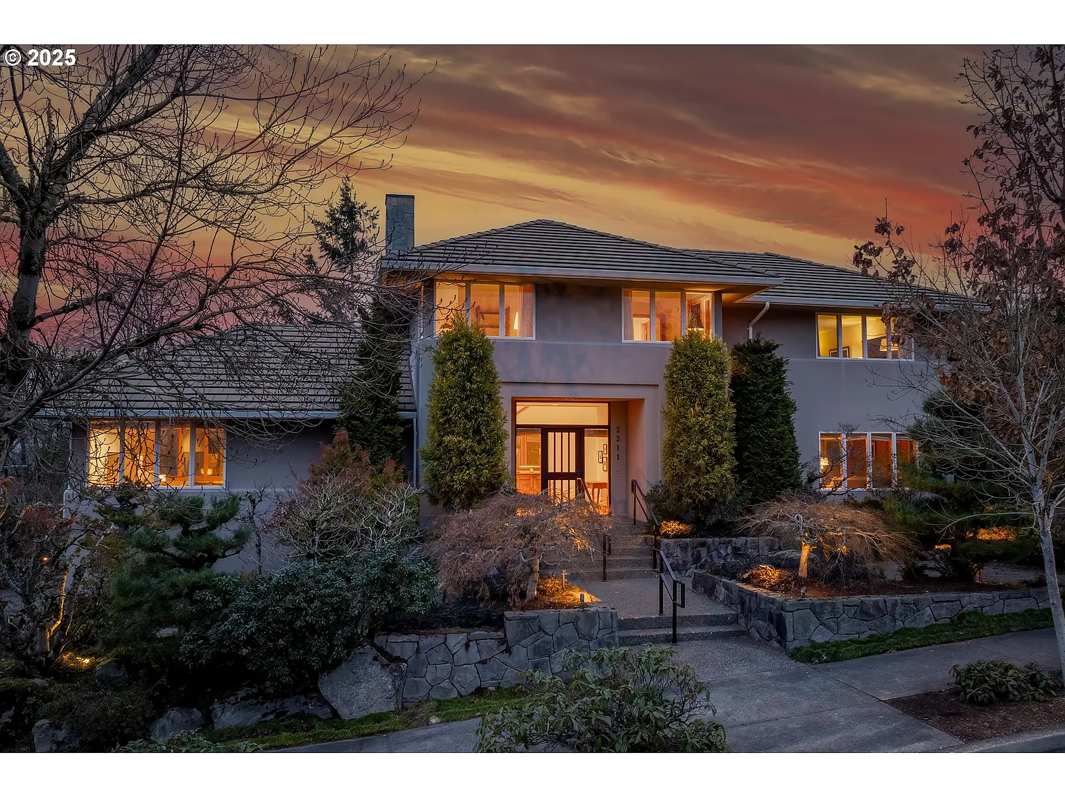 Nestled in Portland's West Hills, this custom-built contemporary home uses thoughtful design to maximize natural light and stunning views. Tall ceilings and rows of picture windows flood the interior with sunlight throughout the day, highlighting clean lines, warm wood trim, and elegant built-in details. Distinctive architectural elements, like a curved staircase and illuminated floating tray ceilings, emphasize the home’s unique craftsmanship. A functional layout seamlessly connects multiple gathering spaces - a living room with a floor-to-ceiling stone fireplace and a dining room with handmade built-ins both open onto a spacious deck, creating an effortless indoor-outdoor flow perfect for entertaining. The kitchen pairs extensive counter space and high-end appliances, including dual wall ovens and a Sub Zero refrigerator/freezer, with a sun-drenched breakfast nook that opens to a side yard. Completing the main level are a full bath and a versatile den with outdoor access that could serve as a 4th bedroom. Upstairs, the primary suite captures both northern and southern light through two walls of windows, and features dual closets and a luxurious bath with soaking tub and shower. A generous laundry/mud room on the lower level offers abundant storage. Meticulously maintained by the original owner, the property is in pristine condition with a low-maintenance yard and backs directly to protected green space. Bordered by 5,200-acre Forest Park and its 80 miles of trails, the Northwest Heights neighborhood offers the ideal blend of seclusion and convenience, just 20 minutes from downtown Portland.