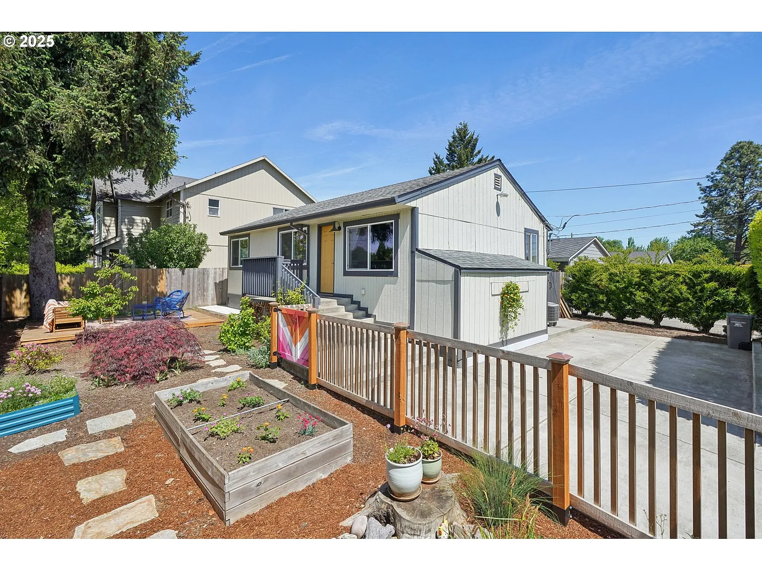 Welcome to your charming oasis at 9705 SE Duke Street! Nestled in Portland's accessible Lents neighborhood, this bright and inviting home offers the perfect blend of convenience and comfort. Just moments from I-205 and blocks from local shops, coffee, and groceries. Enjoy exceptional privacy with tall hedges and a brand-new wood fence on a desirable corner lot. Benefit from off-street parking plus a large concrete pad. The lovingly cared-for yard boasts a delightful frog pond, mature plantings, and space for your green thumb. Relax and entertain on the fantastic floating deck. Inside, discover a light-filled living room, an efficient kitchen, and a newly renovated bathroom. Two generous bedrooms offer comfort, with one featuring built-in storage. Third bedroom perfect for office/nursery/craft room- totally flexible space! Enjoy peace of mind with significant updates including a newer hot water heater, new roof, updated electrical panel, plumbing, and HVAC system. The expansive, clean basement presents endless possibilities with exterior entry – create a home gym, studio, or even explore adding an in-law suite or ADU. Don't miss the opportunity to call this move in ready sweetie home! [Home Energy Score = 4. HES Report at https://rpt.greenbuildingregistry.com/hes/OR10238111]