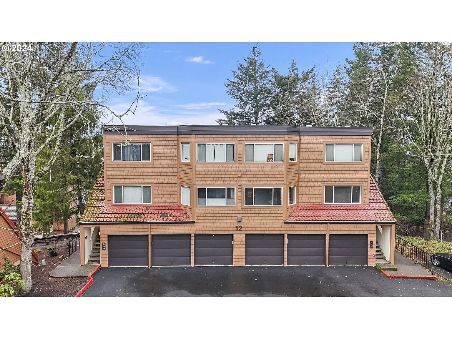 Oswego Summit's middle unit has views from the main level of trees and hills to the north. Updated appliances in the kitchen have engineered flooring. The eating area opens to the family room with a wood-burning fireplace. Wetbar and built-in shelving with brand-new carpet. upstairs features updated bathrooms and two bedrooms. The suite features a closet organizer and glass shower doors and a tile shower. Lake Oswego address and Portland Scholls.Private wrap-around deck with storage closet. The garage is the far right door closest to the unit.