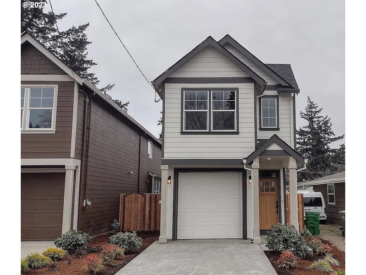 Kitchen custom cabinets, island, quartz counter tops, SS appliances & Micro-hood. Water resistant laminate floors. Primary BR with walk-in closet and double vanity sink in Primary bath. High efficiency gas furnace. Large backyard and close to transit. Hurry, garages are going away in Portland! Special pricing for SDC waiver qualified buyers. $469,900 for non-qualified transactions.