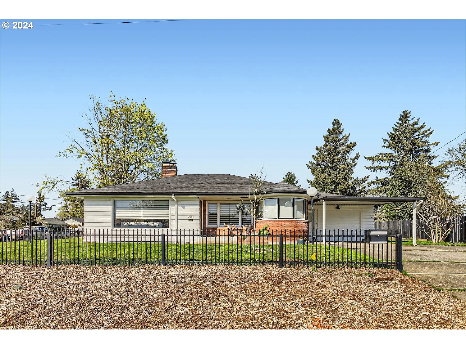 Charming 2 bedroom mid-century ranch home on large corner lot. Refinished hardwood floors throughout. Living room has picture window and wood burning fireplace. Newer Levolor blinds in living and dining room. Kitchen has new porcelain tile floors, induction stove top range and breakfast booth with bay windows. Insulated garage makes for great bonus space. Half bath and laundry room with newer lifeproof laminate floors off garage/bonus space. Covered patio and spacious fenced backyard with fire pit, raised garden beds and 1 fig tree, 2 pear trees, 3 blueberry bushes & 1 raspberry bush. Carport and room for more parking. Re-inforced attic space for extra storage. Electric furnace and air conditioning are less than a year old! Close to schools and parks. [Home Energy Score = 6. HES Report at https://rpt.greenbuildingregistry.com/hes/OR10226301]