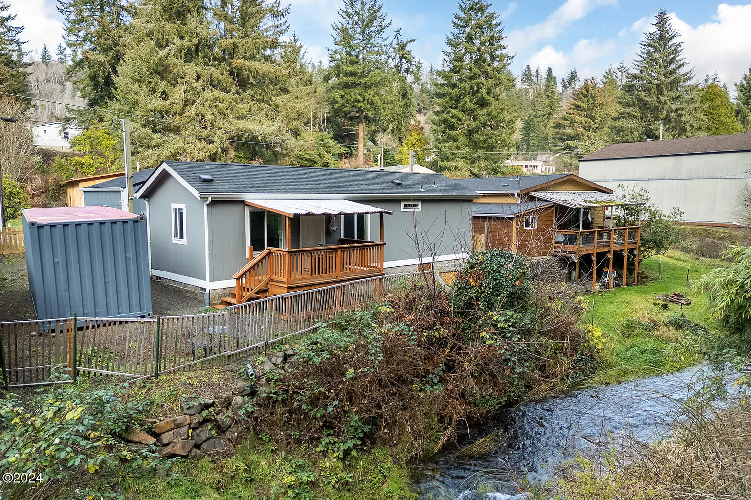 Discover your coastal retreat in this beautiful 2-bedroom, 1-bath home on an oversized lot. With gorgeous flooring and abundant windows, this space is filled with natural light. Enjoy outdoor living with a fantastic back deck and front patio, both featuring a privacy fence for a serene atmosphere. Inside, you'll find laundry hookups, while the wired shop offers additional washer and dryer hookups and a Bluetooth-capable smart roll-up door for easy access. Recent upgrades include a new roof on the oversized garage and a covered backyard patio overlooking the creek. A metal shipping container is also available for use as a workshop/office with power, and there are RV hookups on the driveway. With fresh paint throughout and just moments away from Lincoln City's shops, restaurants, and stunning beaches, this home is ready for you to move in and enjoy! Don't miss out on this fantastic opportunity!