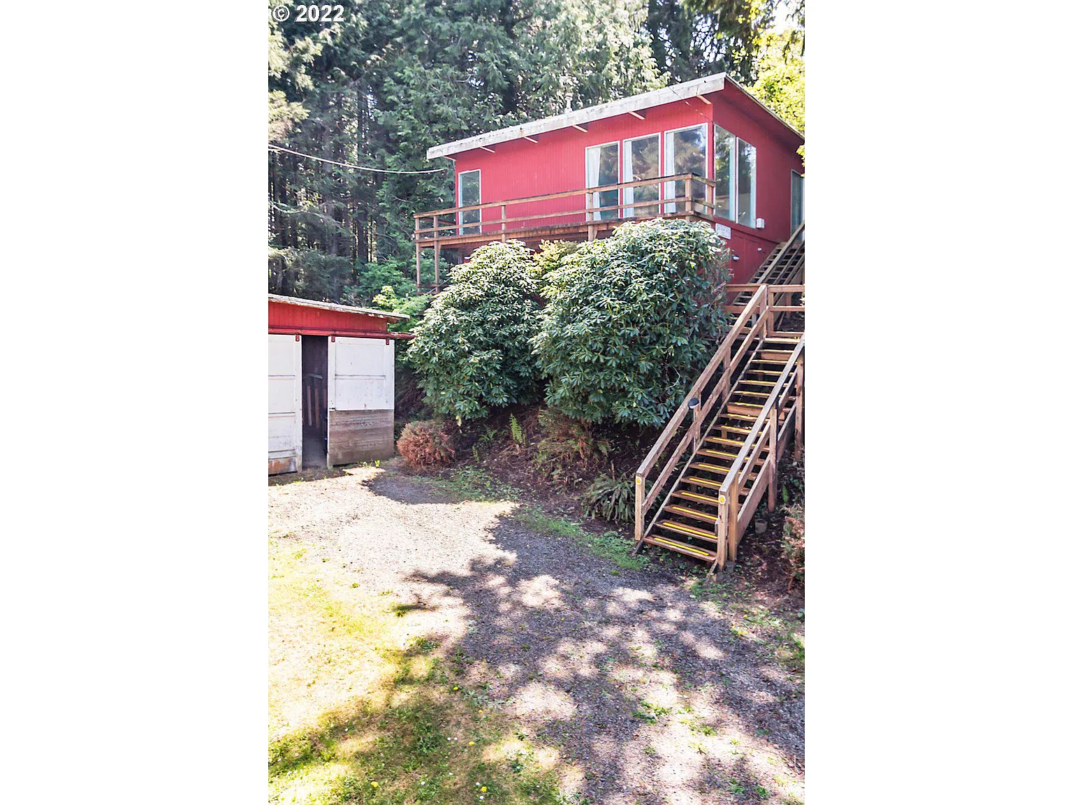 PRIVATE COAST RETREAT. One bed, 1.5 bath hideaway with 20th century modern style, wood beamed ceiling, open interior, and windows in all directions. Kitchen has butcher block countertop with eating bar. Full bathroom upstairs. Spiral staircase leads to cozy downstairs bedroom with half bath and deck. Home warmed by pellet stove and newer electric furnace. Secluded backyard with nature on all sides. Short walk to harbor for fishing or stroll to town for dining and brews. Offered 'as is' condition