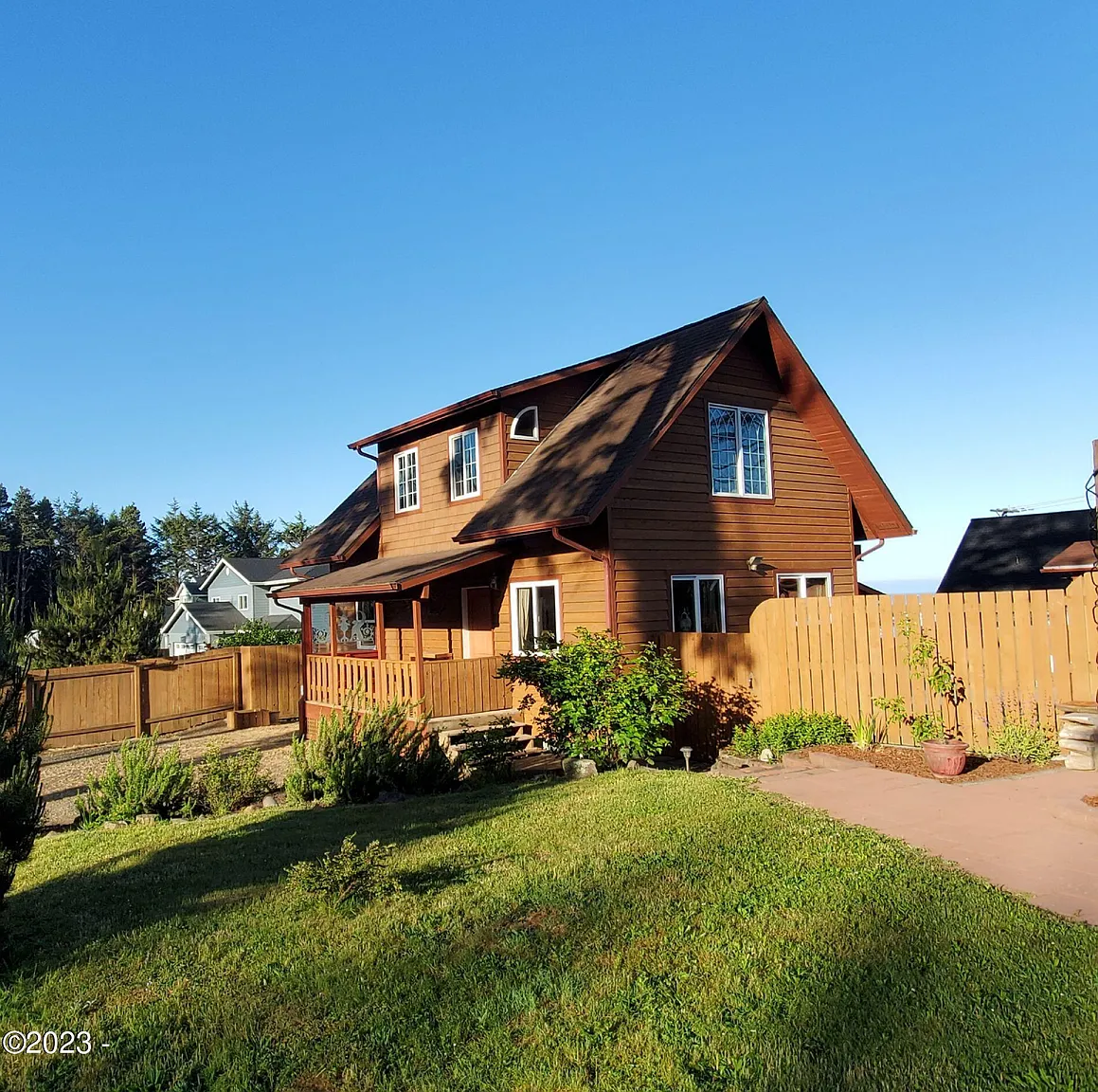 Custom-built home near Beverly Beach State Park with ocean views and potential to expand on .34 acre. Nestled on a dead-end street in a great neighborhood, this charming residence features cedar siding and a warm interior with hickory floors and kitchen cabinets. The kitchen boasts granite countertops, soft-close drawers, and a built-in breakfast nook with storage. Upstairs has vaulted ceilings and an open den. The spacious primary bedroom includes an en suite with a jetted tub and walk-in shower. Enjoy ocean views from the balcony. The large property is fenced with chain-link and cedar fencing. Additional features include an outdoor hot water faucet, a 200 sqft workshop with electricity (could be finished for guest quarters), a storage shed, and greenhouse. Additional parking, a chicken coop and Tuff shed on North part of property. Walking distance to the beach and forest trails. Short drive to Newport and Depoe Bay. Notably, the property offers expansion potential with an already installed 3-bedroom septic system, allowing for a third bedroom. The property also has space for a garage with a loft **Due diligence required. Experience coastal lifestyle and unleash the possibilities of this extraordinary property.