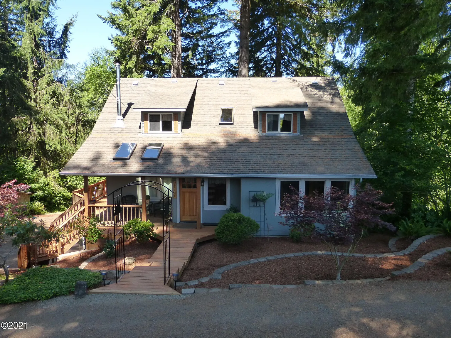 Beautifully updated & maintained, this home sits in a very private & forested 5.4 acre setting. Features hardwood floors, beamed ceiling, & a new Lopi woodstove in the main living area, a large kitchen with custom cabinets & lots of storage & SS appliances including a Wolf propane cooktop with griddle. The master suite has an attached den/office/sitting area, a walk-thru closet, a shared bath, & a private balcony with jetted tub. Upstairs are 3 more bedrooms & a bath surrounding a game/TV room with built in storage. The lower level has a one bedroom, one bath apartment or guest accomodation with three outside entrances & a double garage with laundry hookups. All new decks & stairs with covered porch in front & covered deck off of the kitchen/dining areas. On 3 tax lots & city services too!