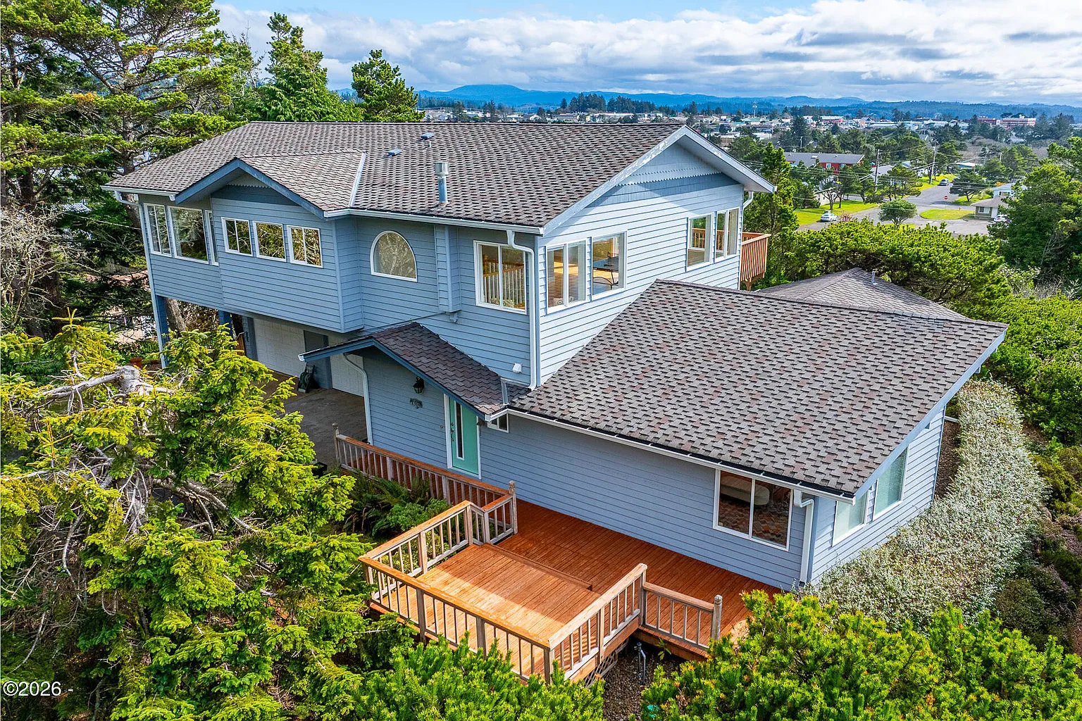 Welcome to this exceptional Newport beach retreat, an elevated home with panoramic ocean views, privacy, and thoughtful updates come together in a remarkable setting. The listing price includes the adjacent ocean-view lot. Perched high above the shoreline at the end of a quiet lane, this home captures sweeping vistas of the Pacific, surrounding coastal peaks, and iconic glimpses of Yaquina Head Lighthouse and Yaquina Bay Bridge. Peaceful and secluded atop its knoll — yet less than a mile from shops, restaurants, and groceries, and even closer to local beach access leading down to Nye Beach — this location offers the best of both retreat and convenience, whether as a full-time residence or a refined coastal getaway. The upper level is wrapped in windows, creating a light-filled, expansive space designed for flexibility and gathering. Whether used as a game room, exercise studio, media room, office, and/or creative retreat, this level adapts effortlessly to your needs. On the main level, living spaces capture serene greenery views, offering an inviting backdrop for everyday living and hosting. Beautifully updated and bright, the spacious kitchen offers generous workspace, while the open floor plan creates effortless flow between cooking, dining, and gathering. Outdoor living is just as inviting, with three distinct decks. A spacious three-bay garage provides ample room for vehicles, beach gear, and even a workshop. Thoughtfully updated for modern sustainability and style, this home blends comfort with efficiency. Recent improvements include solar panels, energy-efficient ductless heat pumps for heating and cooling, a hybrid heat pump water heater, updated stainless steel appliances with an induction range, and a Level 2 EV charger. The additional lot protects your views while offering future possibilities. Set in a prime location with fabulous views and privacy, this Newport beach home — thoughtfully updated with sustainability in mind — offers an exceptional opportunity for easy coastal living.